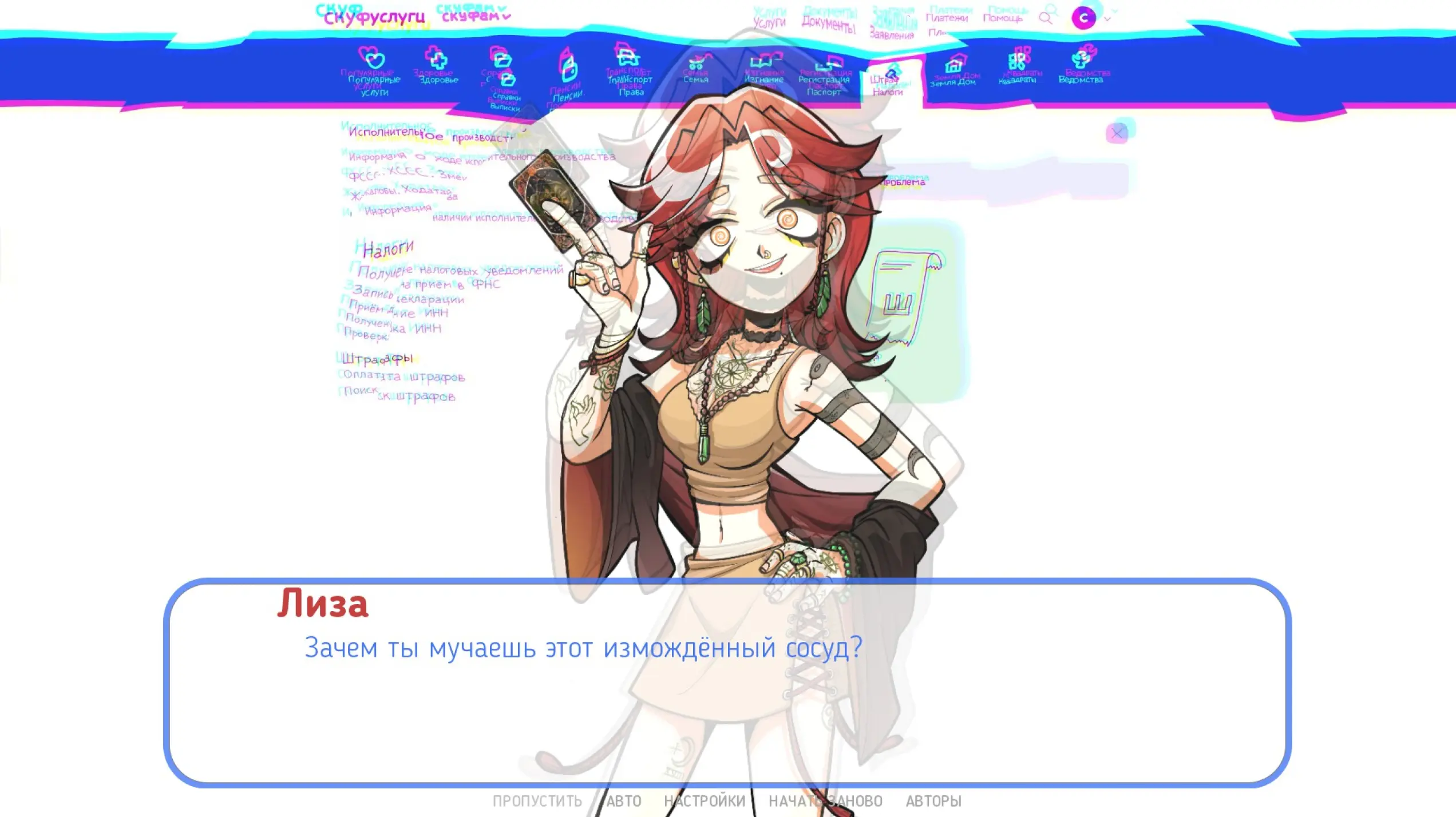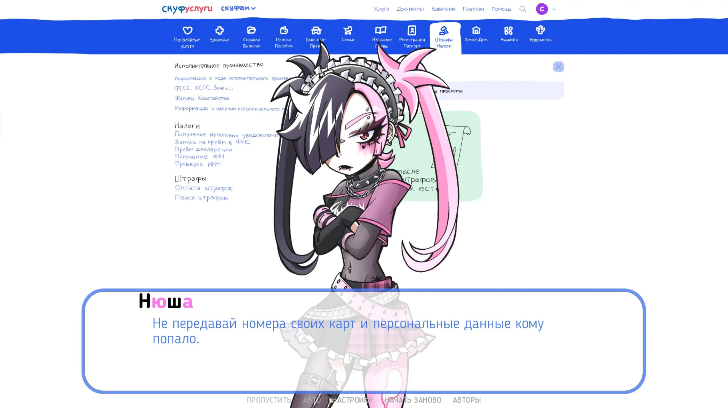 Однако был и забавный момент, когда речь зашла о штрафах: альтушка «находит» неоплаченную квитанцию и предлагает ввести номер карты. Это оказывается шуткой и отсылкой к Насте. Ситуация выглядит любопытно, потому что ты уже готов ругать авторов: неужели они решили ввести ту же сюжетную линию? Но нет, Нюша рассказывает про важность кибергигиены. То есть разработчики не так сильно схалтурили, как с оригиналом: тогда некоторые диалоги были просто скопированы.
