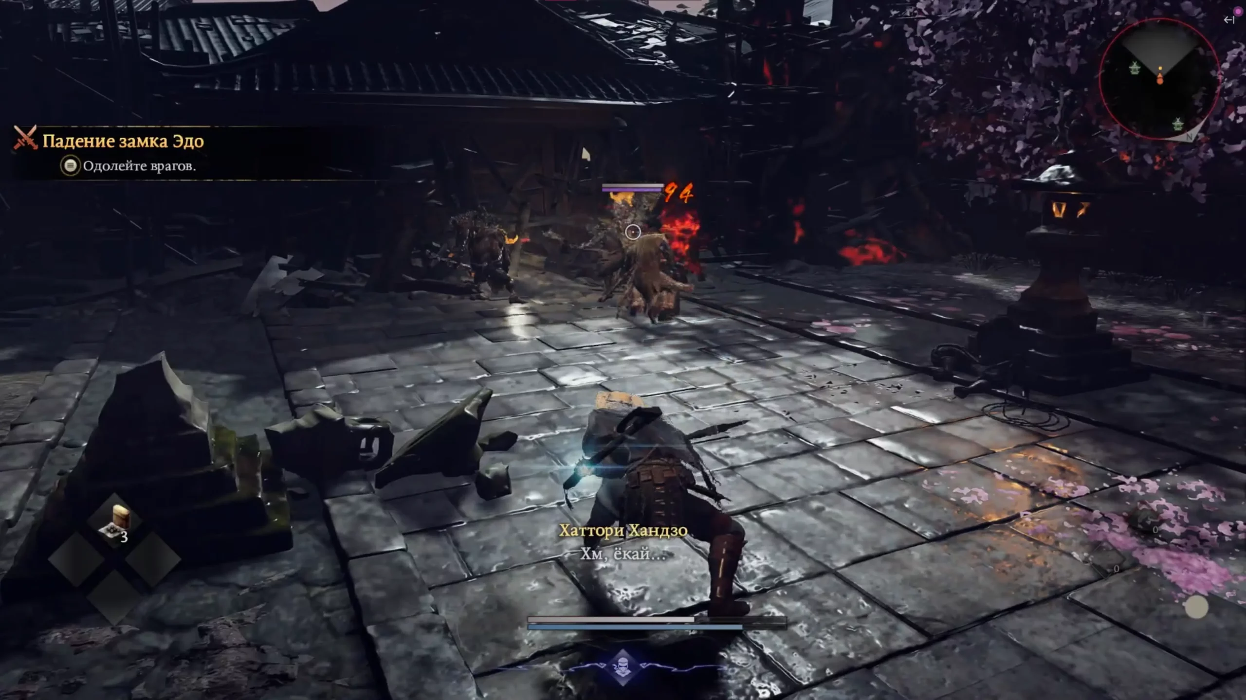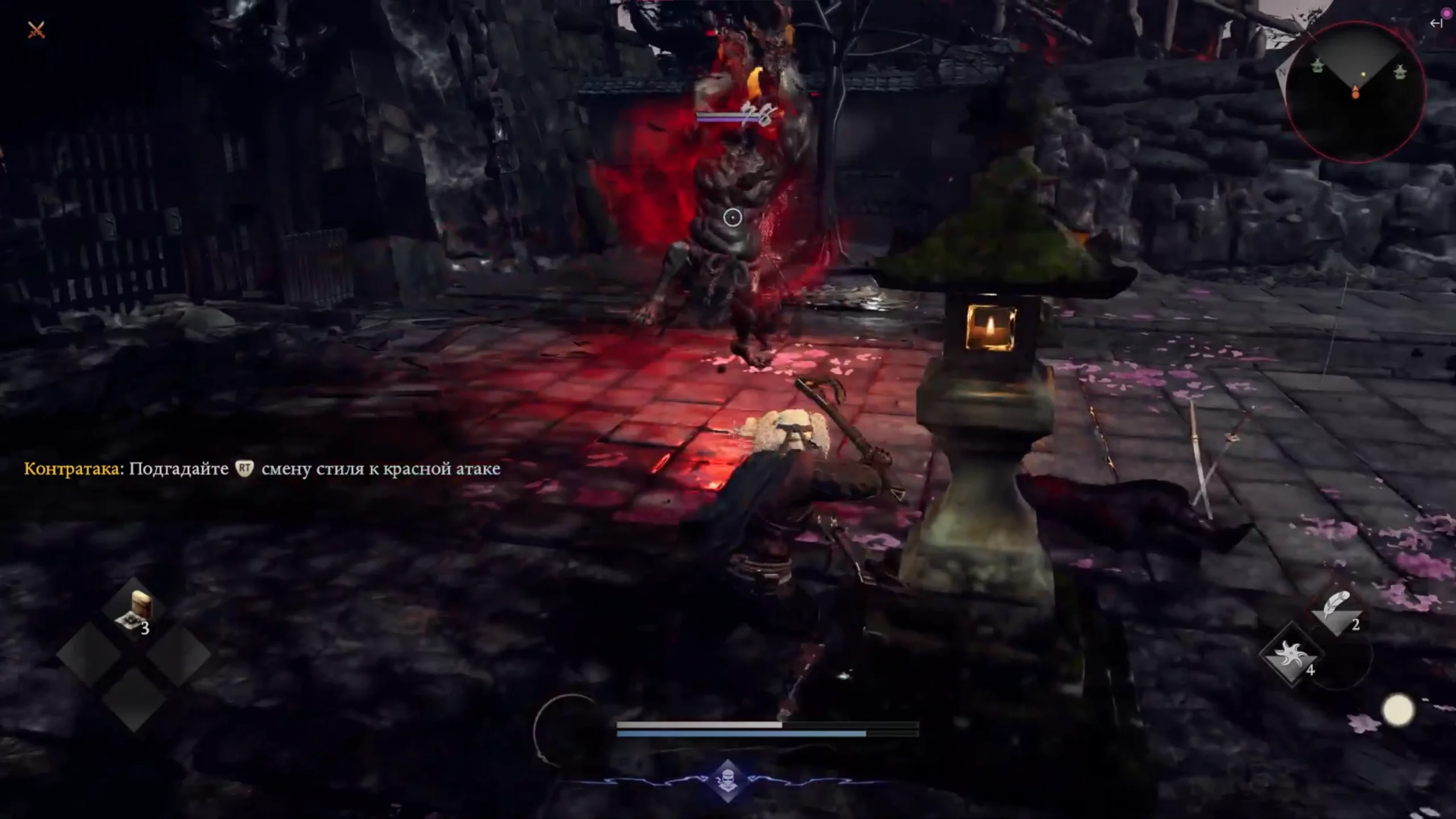 Основной интерфейс достаточно простой — слева крестовина из расходуемых предметов (в том числе «хилок»), а справа — стойки самурая или ниндзюцу в стиле ниндзя.