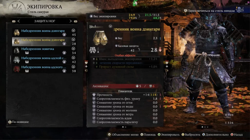 Есть система лута, которая, в отличие от тех же Dark Souls, разделяет предметы по редкости (белые, синие, фиолетовые, желтые). Каждый предмет дает определенный бонус к каким-то характеристикам: это может быть повышение скорости передвижения, снижение расхода ки, увеличение шанса выпадения лута и так далее. В общем-то, тут ничего нового, так как это было и в Nioh, и в Nioh 2.