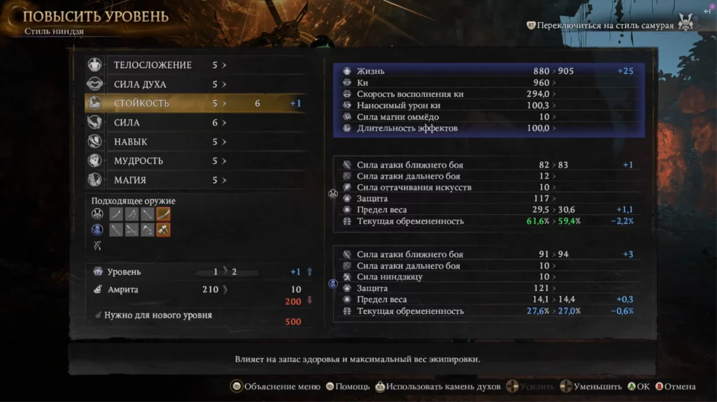 - Уровни — это те самые «пассивки» из souls-игр. Зарабатываете амриту (аналог душ) за убийство врагов и тратите ее на прокачку пассивных навыков, которые дают бонусы к здоровью, урону, запасу ки, переносимому весу и так далее.