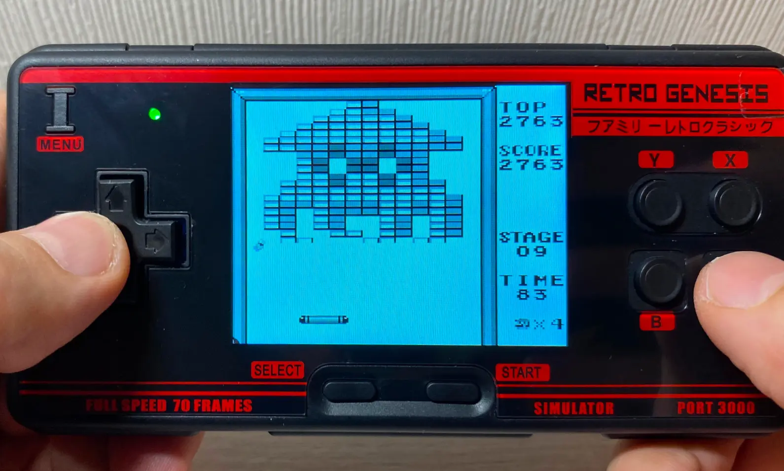 И все же переносные консоли покупают не для игры с телевизора. У Port 3000 — 3-дюймовый экран с неплохим разрешением и регулируемой яркостью. Пожалуй, в положении по умолчанию он даже слишком яркий, особенно для 8-битной пиксельной графики. Работает консоль от аккумулятора типа BL-5C — такого же, как в старых смартфонах Nokia, или от трех батареек AAA. Слот для того и другого общий и находится под задней крышкой.