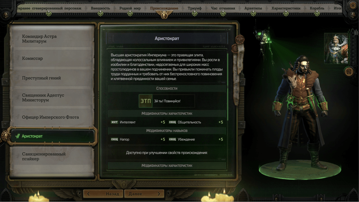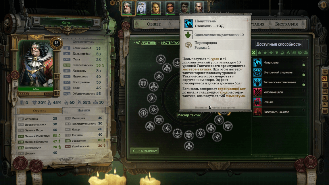 Например, классы. Так как это не классическое фэнтези, где даже при полном непонимании можно интуитивно накликать себе билд разбойника и мага, то понимание местной терминологии дается сложнее. Кого вы выберете — командира — великого стратега, авангарда или архимилитанта? Кто из них стрелок, а кто местный «варвар»? Черт его знает, изучайте, читайте. Способностей в духе «Получите +5 урона при следующей атаке» тут нет. Только комплексные перки с безумными техническими описаниями в духе «Если ваше Превосходство больше 10, то при следующей атаке вы наносите на 15% + ВЫН урона больше по силам Хаоса в четверг, если на вас надеты ботинки».