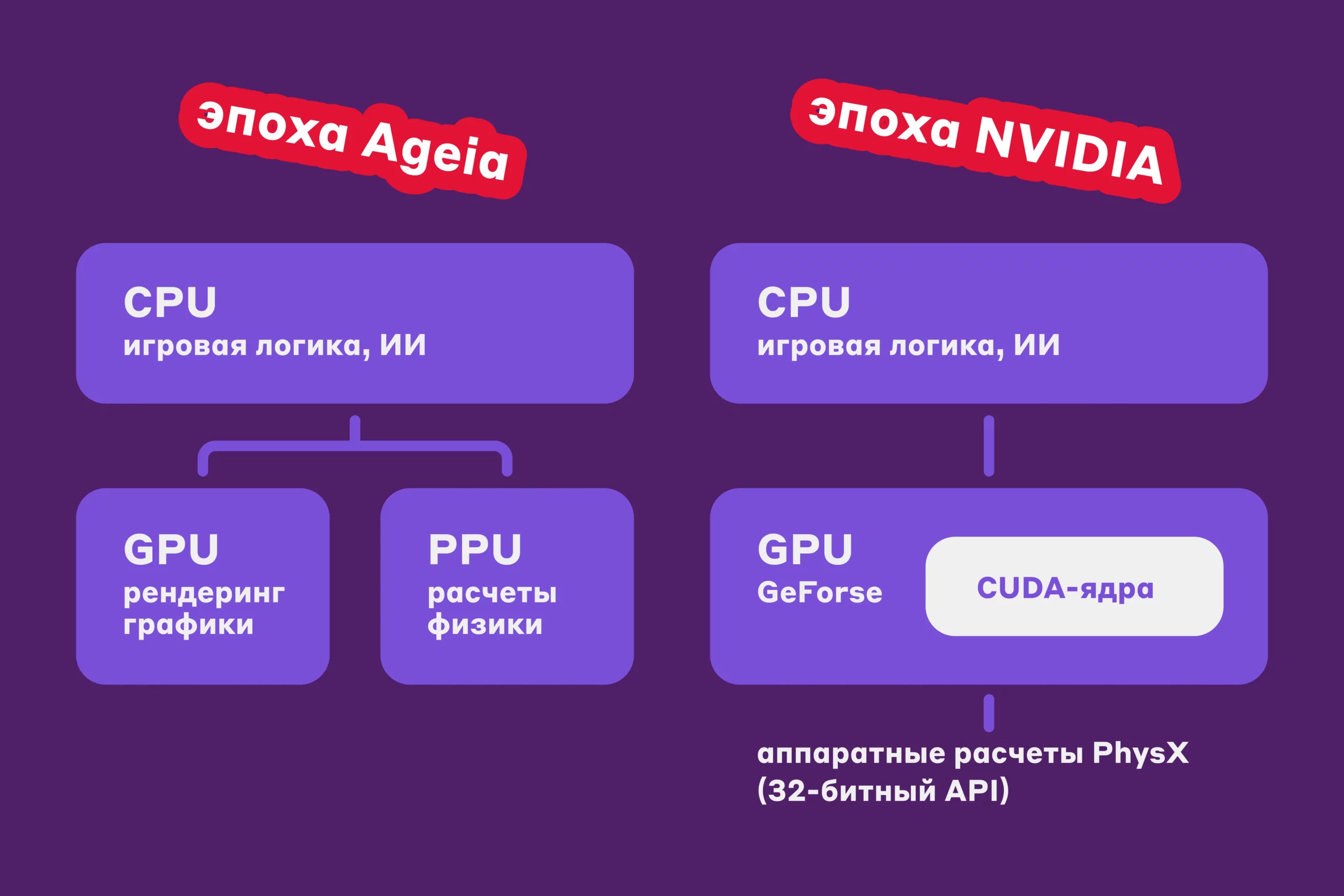 В начале нулевых с физикой в играх все было просто — враги падали, как кегли, взрывы были обычными спрайтами, а мир — статичным. Процессоры того времени просто не могли просчитать сложное взаимодействие тысяч объектов, поэтому разработчикам приходилось идти на ухищрения. И пока все с этим мирились, на рынке появилась компания Ageia, которая предложила безумную по тем временам идею: а что, если сделать для физики отдельный процессор? Так появился PPU — Physics Processing Unit. Это была по сути «видеокарта для физики» — отдельная плата, которая занималась только расчетами столкновений, осколков, тканей и жидкостей.