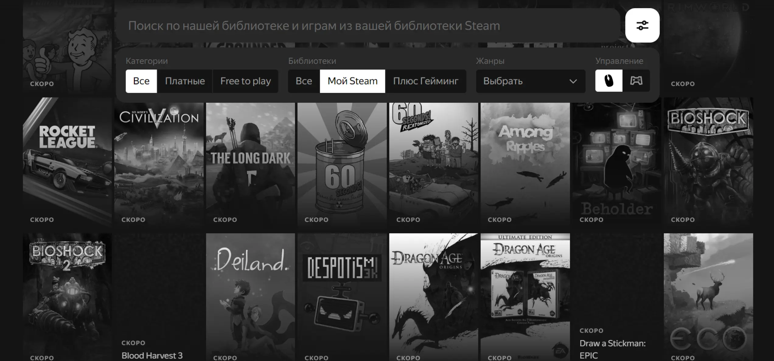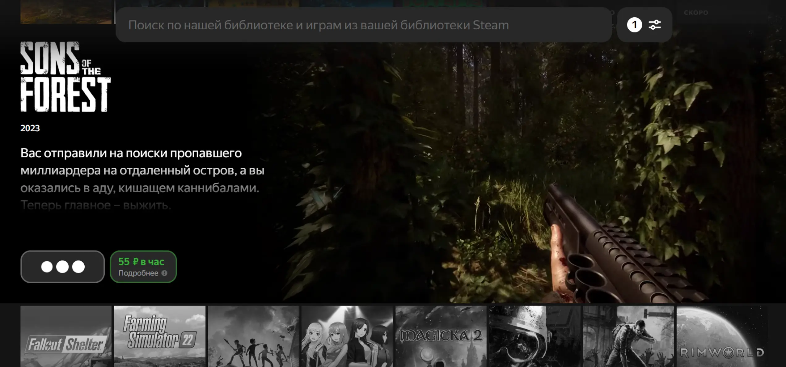 С угрюмым лицом перехожу в библиотеку игр и понимаю, что там очень мало вариантов. Из моих 85 видеоигр доступны только… 14. В этом списке GTA 5, обе части The Forest, Stardew Valley и некоторые другие. Все остальное пока заблокировано с пометкой «Скоро». Из бесплатных и очень популярных проектов есть Counter-Strike 2, Dota 2, Team Fortress 2 и даже «Русская рыбалка 4».