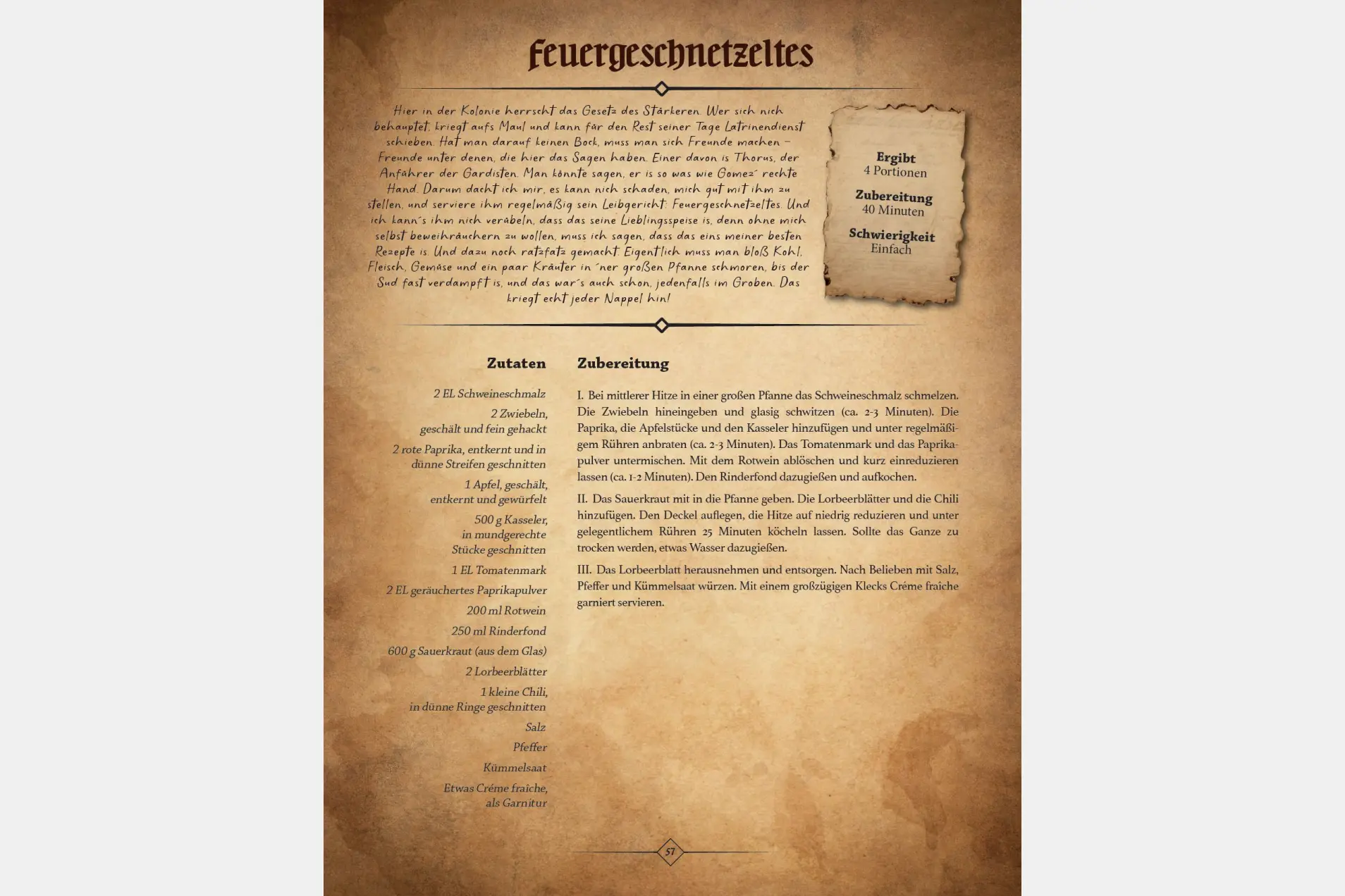 От рагу из мясного жука, любимого блюда повара Снафа, до маринованной огненной травы и даже супа из кровавых мух. Мы получили в руки эту уникальную книгу и не могли не попробовать что-то приготовить. Разве настоящего фаната «Готики» остановит тот факт, что книга издана на немецком языке? Как бы не так!