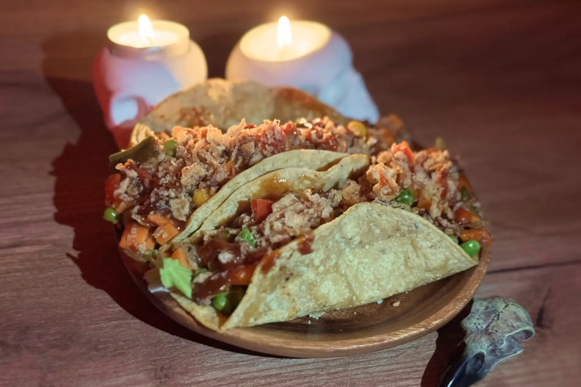 - Сборка тако. Наполните каждую лепешку говядиной, нарезанными томатами, горошком, кукурузой и соусом «Драконье пламя». Добавьте нарезанный красный лук, посыпьте кориандром и сбрызните соком лайма. По желанию добавьте немного соуса «Шрирача» и посыпьте сушеными насекомыми. Мы оказались не готовы к таким экспериментам, поэтому заменили кузнечиков и сверчков на хлопья жареного лука.