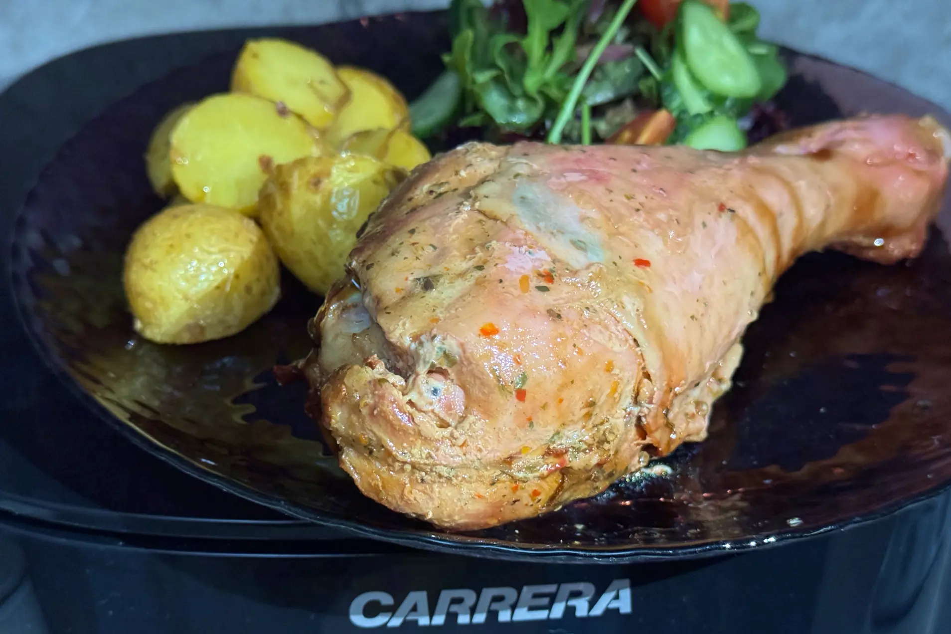 - Запекание. Оберните мясо фольгой. Запекайте в аэрогриле или духовке 1 час. Каждые 15 минут поливайте оставшейся смесью.