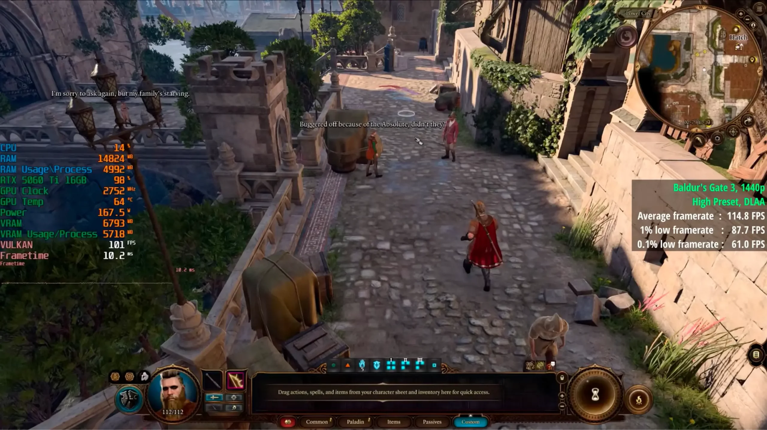 Нижний город с немалым количеством NPC выглядит плавно и красиво: около 100 fps на высоких настройках с генерацией кадров на баланс.