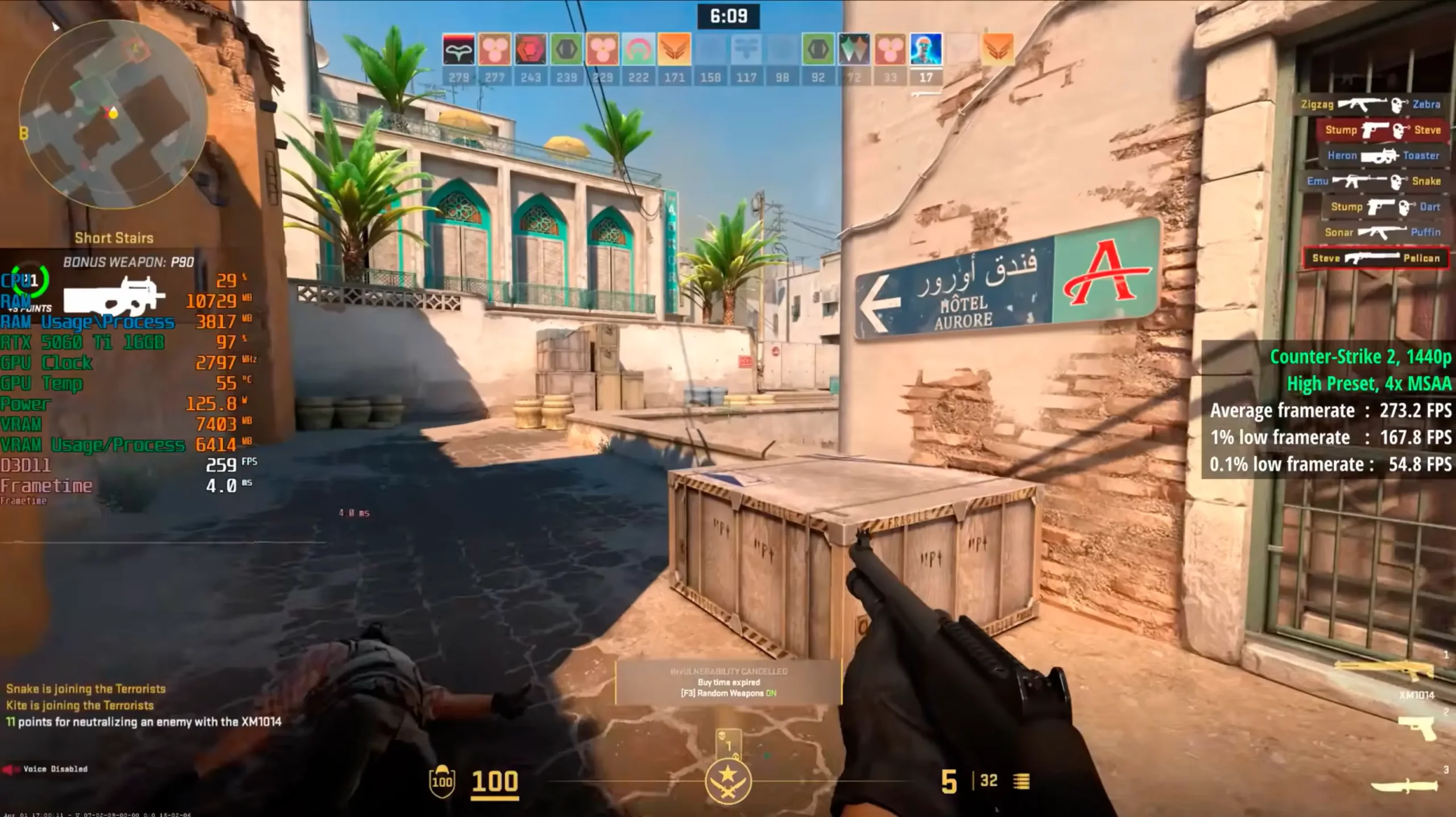 Показатель частоты на высоких настройках графики находится в диапазоне 200−300 fps. Но разрешение в этот раз 1920×1440 пикселей, т. к. 2560×1440 пикселей недоступно при соотношении сторон 4:3, привычном для опытных игроков. Киберспортивные 165 кадров в секунду имеются, так что играть приятно. Самое то для серьезных киберкотлет!