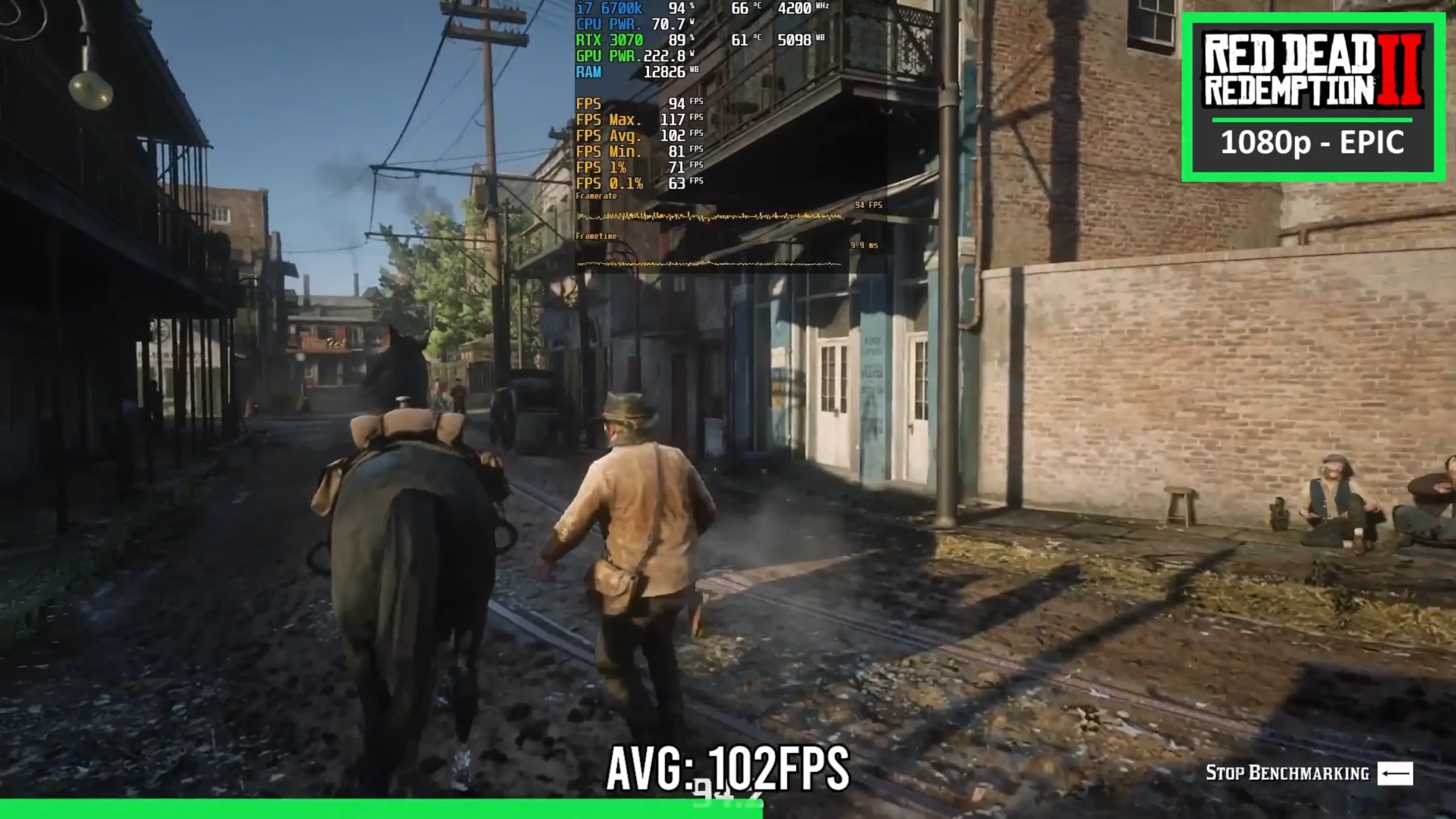 Red Dead Redemption протестировали в разрешении 1080p на ультранастройках графики в динамичной сцене перестрелки верхом на коне. Результат составил 98 fps в среднем и 92 fps в 1% LOW. При этом загрузка видеокарты составила почти 100% при 33% у процессора.