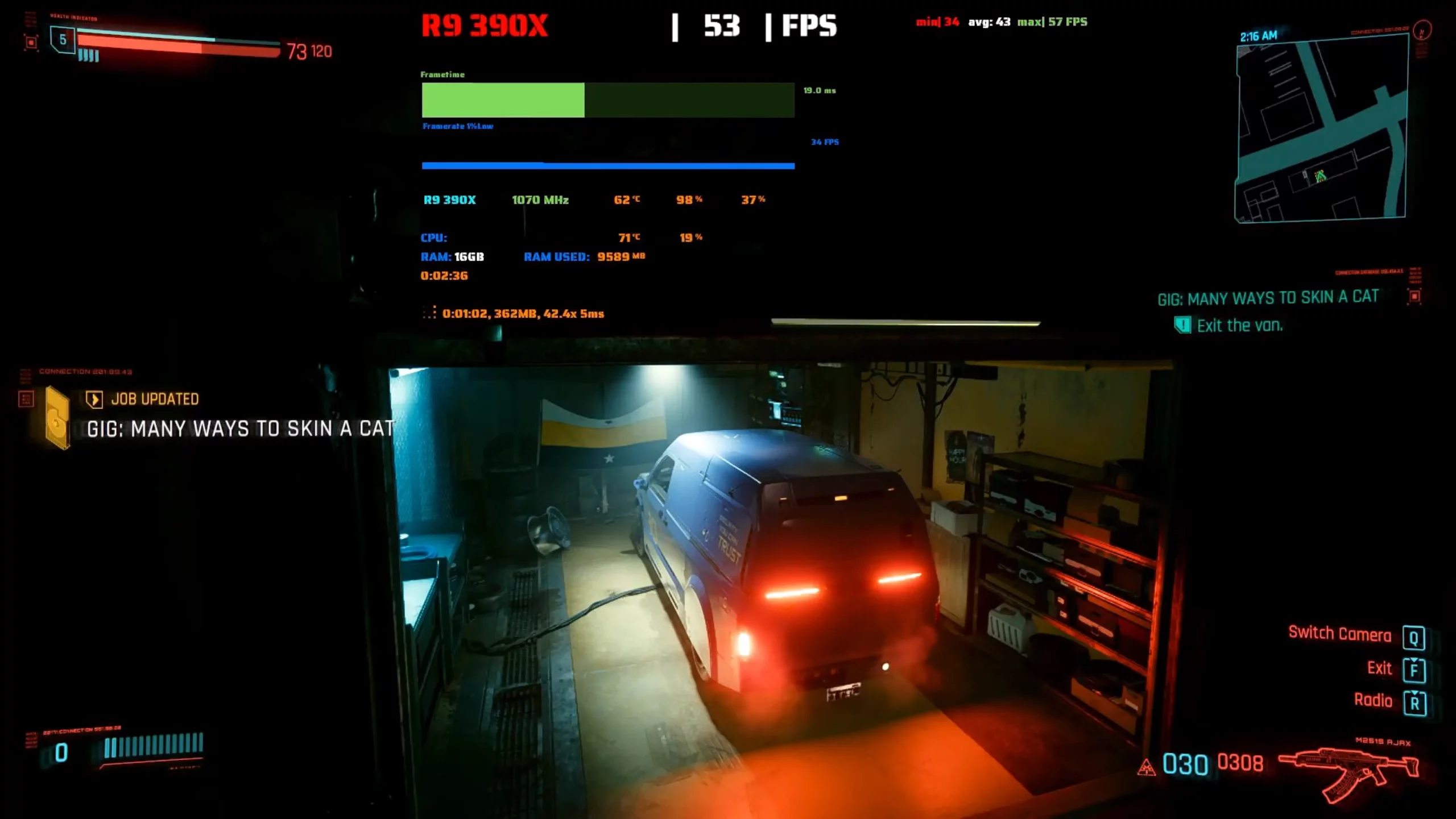Cyberpunk 2077 протестировали на средних настройках графики в разрешении 1080p. Персонаж ехал на машине по ночному городу без трафика во время выполнения миссии. Средняя частота составила 42 fps, 1% LOW — 34 fps. Игра загрузила видеокарту под 100%, а процессор работал примерно на 25% мощности.