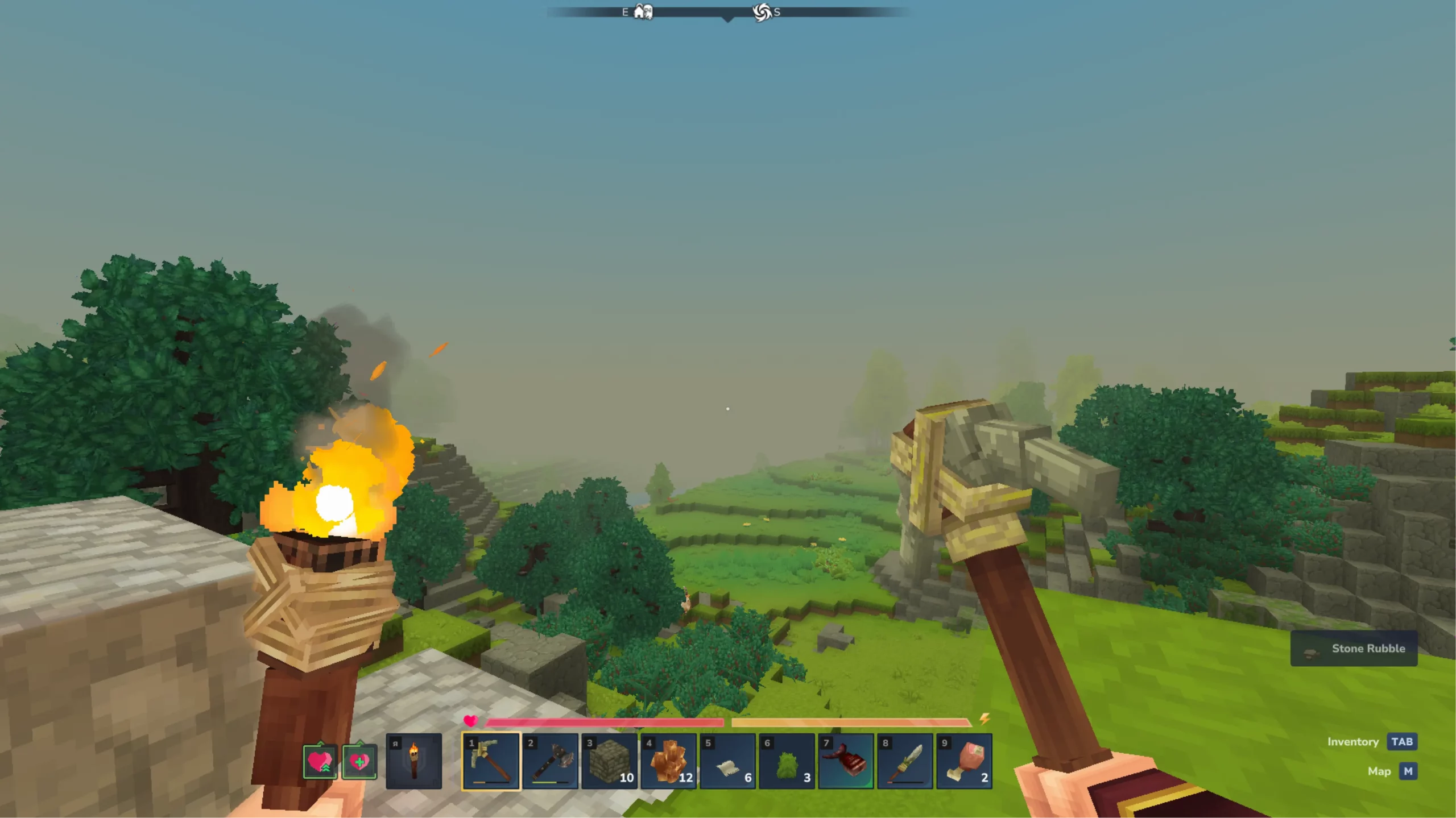 Кулаком даже деревья ломаются довольно медленно — бревна стали далеко не первым ресурсом, который стоит добыть. На земле валяются камешки, а из травы «выпадают» веревки — вот и собраны ресурсы, из которых можно сделать первый топорик и другие инструменты начального уровня. Верстак для этого не понадобится! Несколько ключевых рецептов, включая простейшее снаряжение, костер для приготовления еды, сундук и сам верстак, можно изготовить прямо в инвентаре. И это сильно поможет в путешествиях.