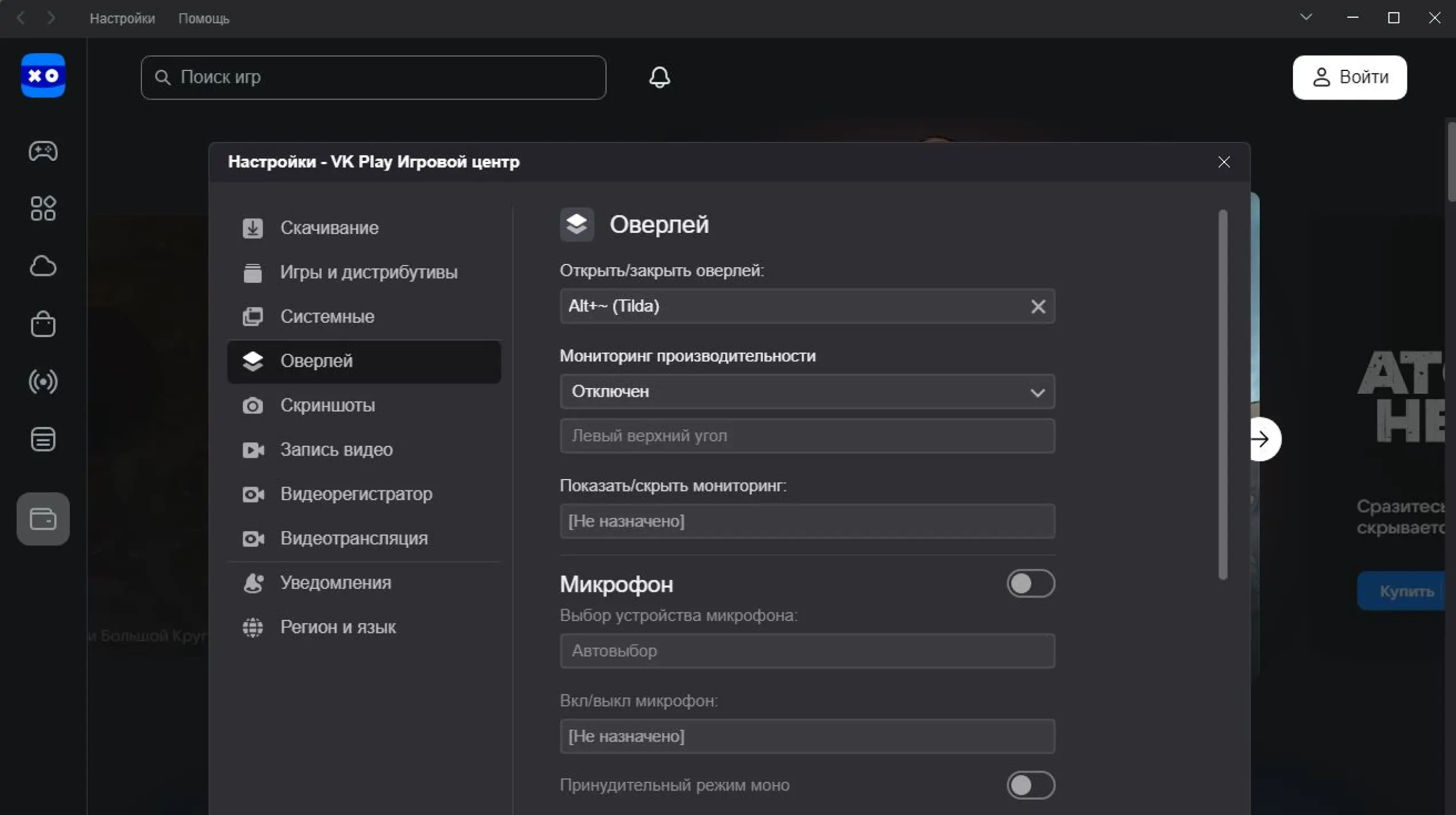 В «Игровом центре» VK Play тоже есть такая функция. Чтобы ее включить, загляните в настройки вверху лаунчера, выберите вкладку «Оверлей» и в пункте «Мониторинг производительности» нажмите «Показ кадров в секунду».