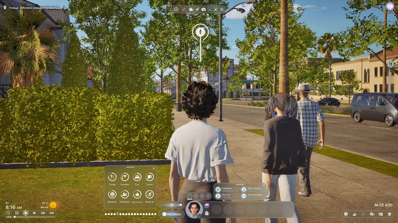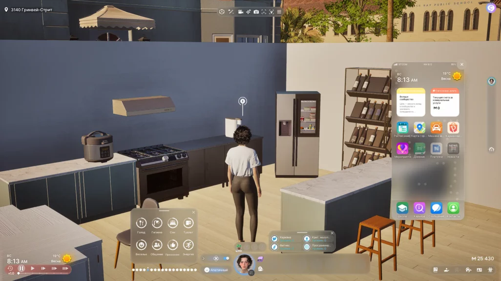 На главной панели находятся таблица навыков «зои», мысли (что персонаж хочет сделать) и показатель настроения. А еще на панельке справа от портрета персонажа есть смартфон — с помощью его можно позвонить кому-нибудь, купить машину, устроиться на работу, поступить в школу или университет, отслеживать прогресс «зои» в амбициях. Словом, это своеобразный центр управления.