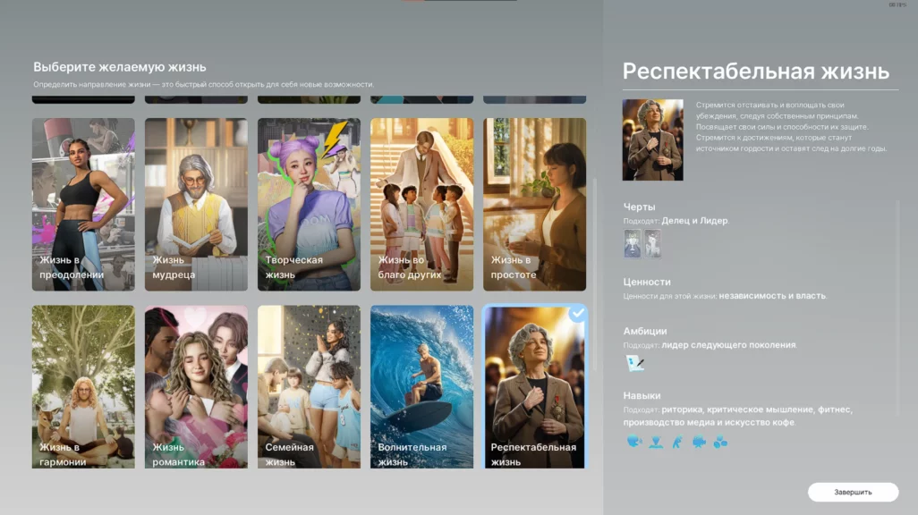 Жизненную цель лучше всего брать в паре с подходящей чертой характера. Например, «Лидеру» подойдет «Респектабельная жизнь». От цели будут зависеть предпочтения персонажа и то, чего он хочет достичь в рамках виртуального существования. Всего на выбор 15 жизненных целей и одна универсальная — нет конкретной привязки к ценностям и предпочтениям, свободный режим игры.