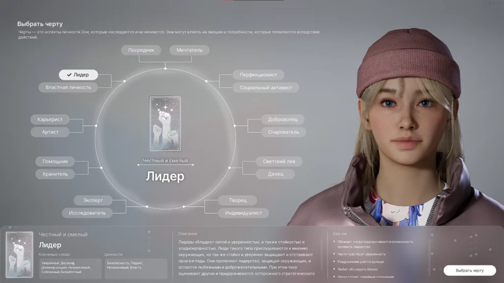 При создании персонажа ему также нужно выбрать желаемые черты характера и жизненные цели. Это придает «зои» как положительные эффекты, так и какие-либо отрицательные качества. Например, «Лидер» часто чувствует уверенность и может поддержать разговор о бизнесе, но чувство раздражения у него длится дольше.