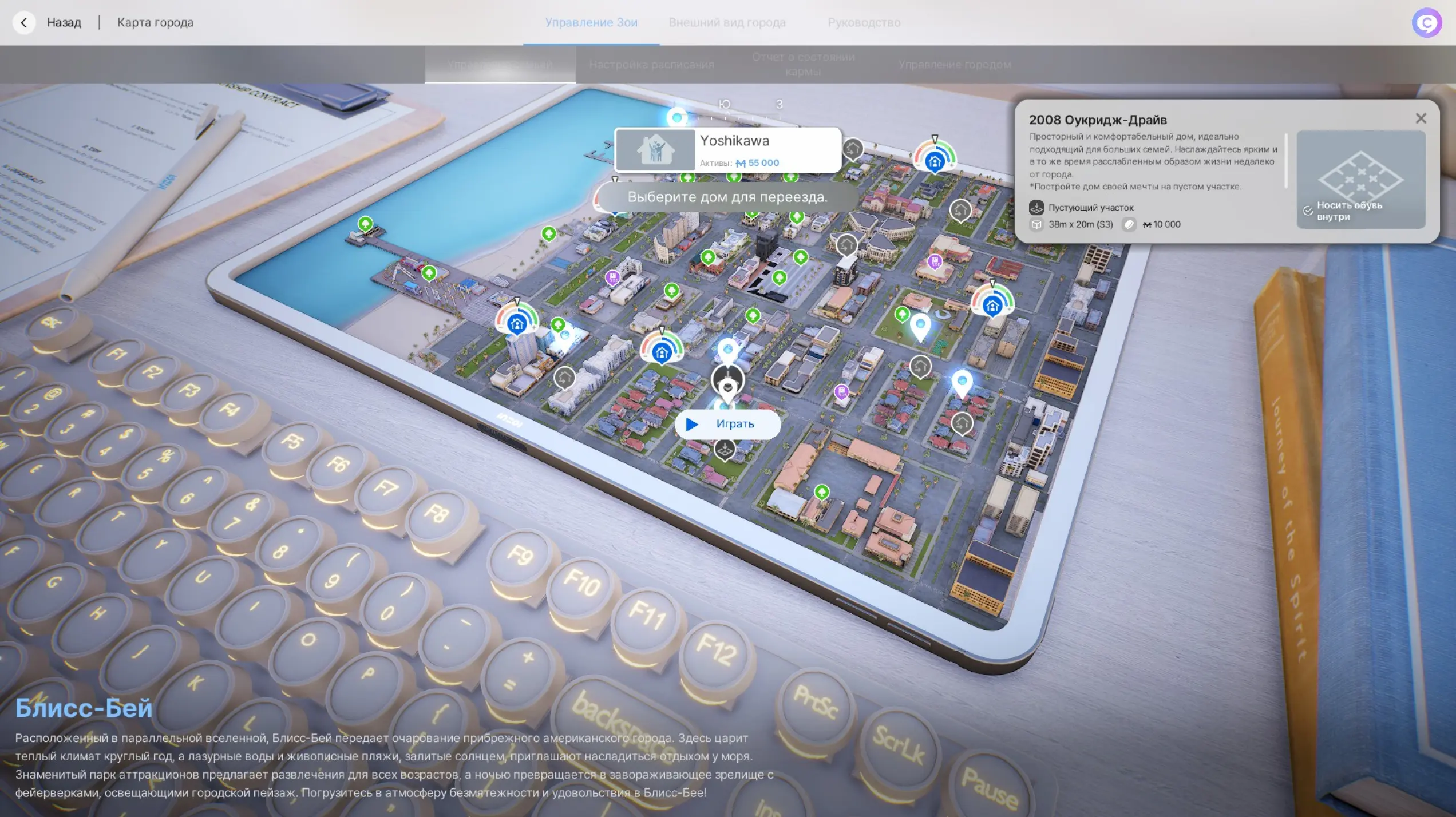 В выбранном городе доступны участки для покупки или готовые дома — все как в The Sims. В начале персонажу даются 55 000 внутренней валюты, которую можно потратить на приобретение готового жилища или участка.