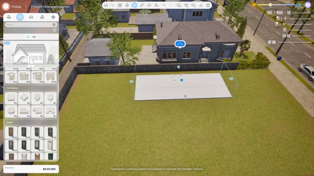Сам процесс строительства подробный, но интуитивно непонятный. С непривычки очень сложно разобраться, как работать с материалами (например, растягивать их). Небольшая подсказка, если планируете играть: пользуйтесь верхней панелью. При наведении на каждую функцию всплывает подсказка о ней.