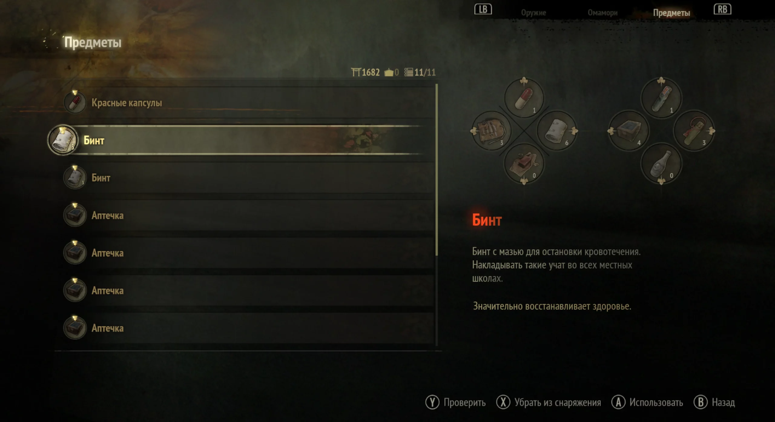 Расходники в игре можно разделить на три категории по типу пополнения ресурса: здоровье, выносливость, здравомыслие. Это могут быть напитки, еда, бинты, аптечки и так далее. В этом плане без инноваций.