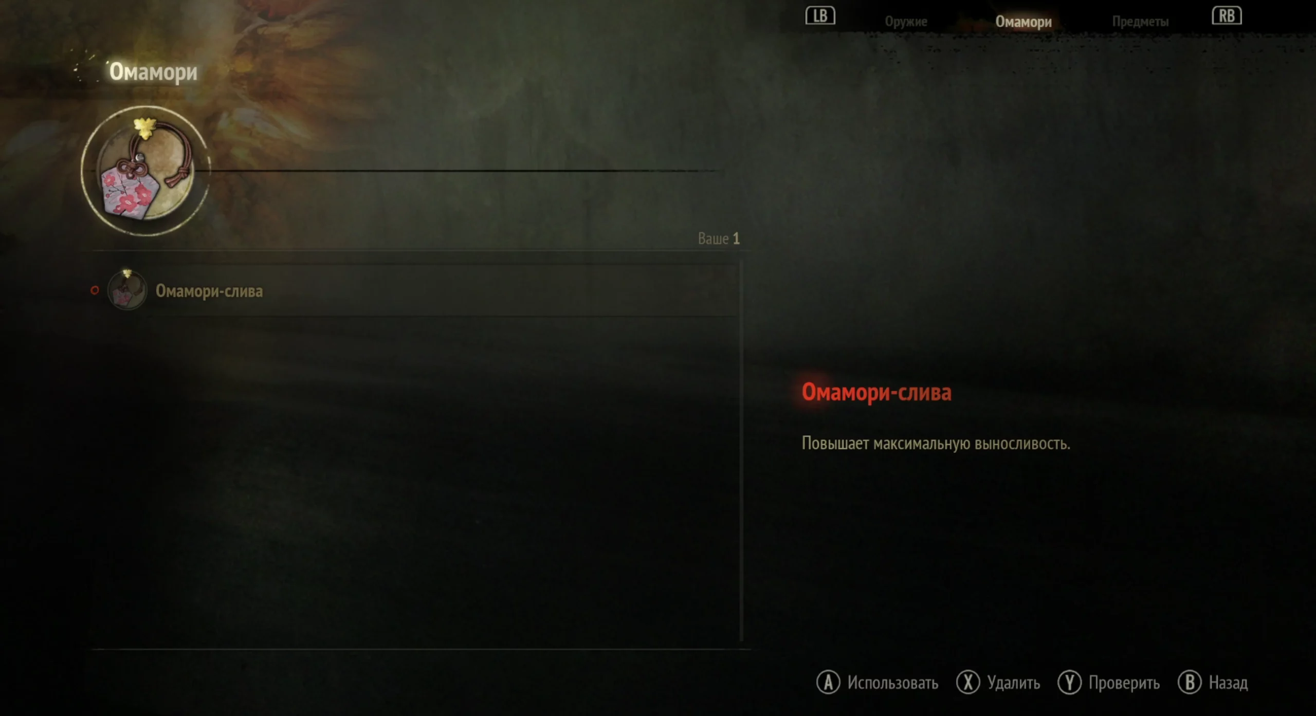 Омамори дают постоянные пассивные бонусы персонажу, например снижают входящий урон во время уклонения, повышают восстановление выносливости, увеличивают урон оружия при максимальной прочности. Амулеты полезны, но можно носить максимум три.