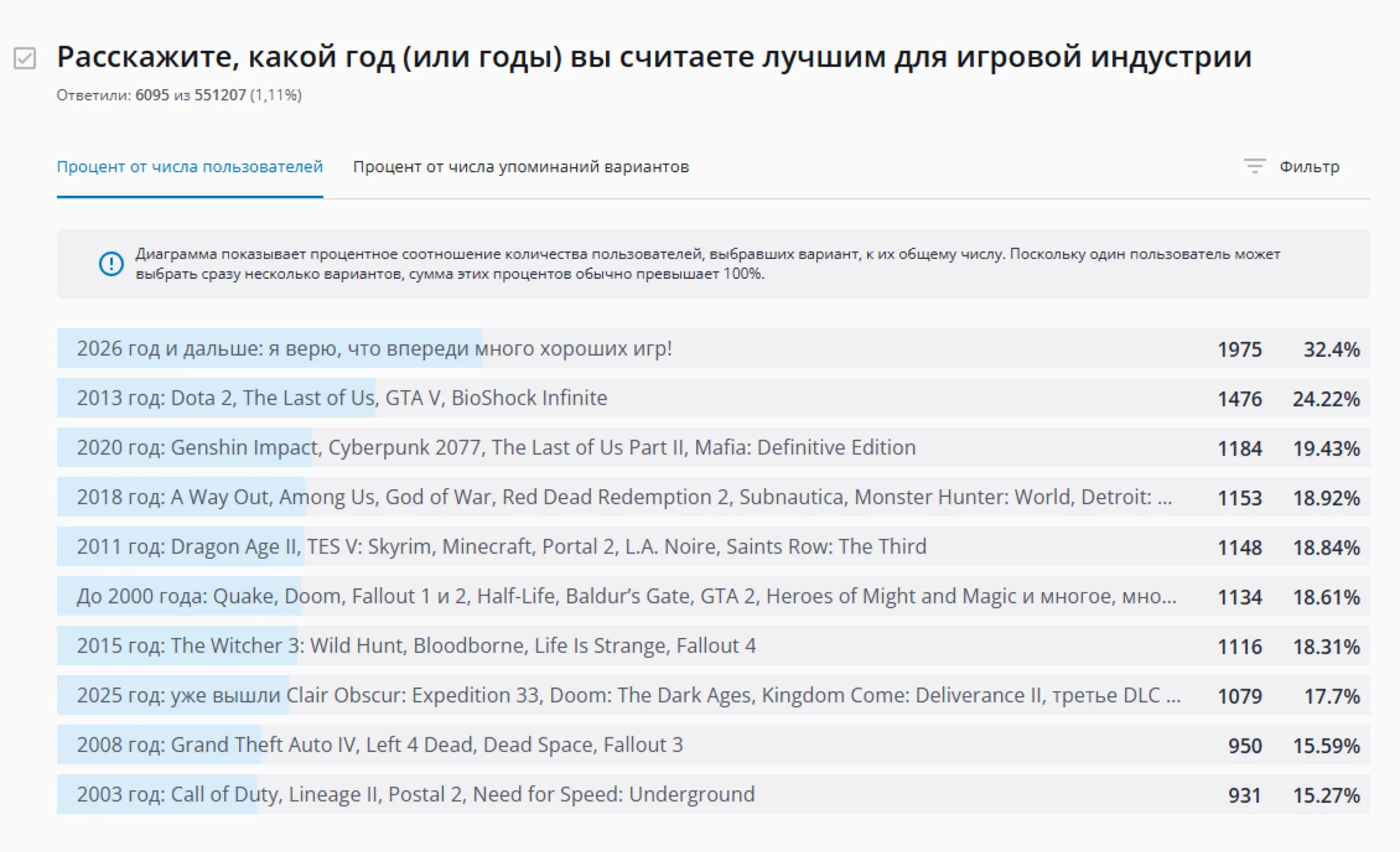 Но не буду томить и перейду к главному. Итак, какой же год участникам опроса запомнился лучше всего? Ни за что не угадаете! Большинство участников (32,4%) считают, что лучшее впереди и что в будущем выйдет много отличных игр.