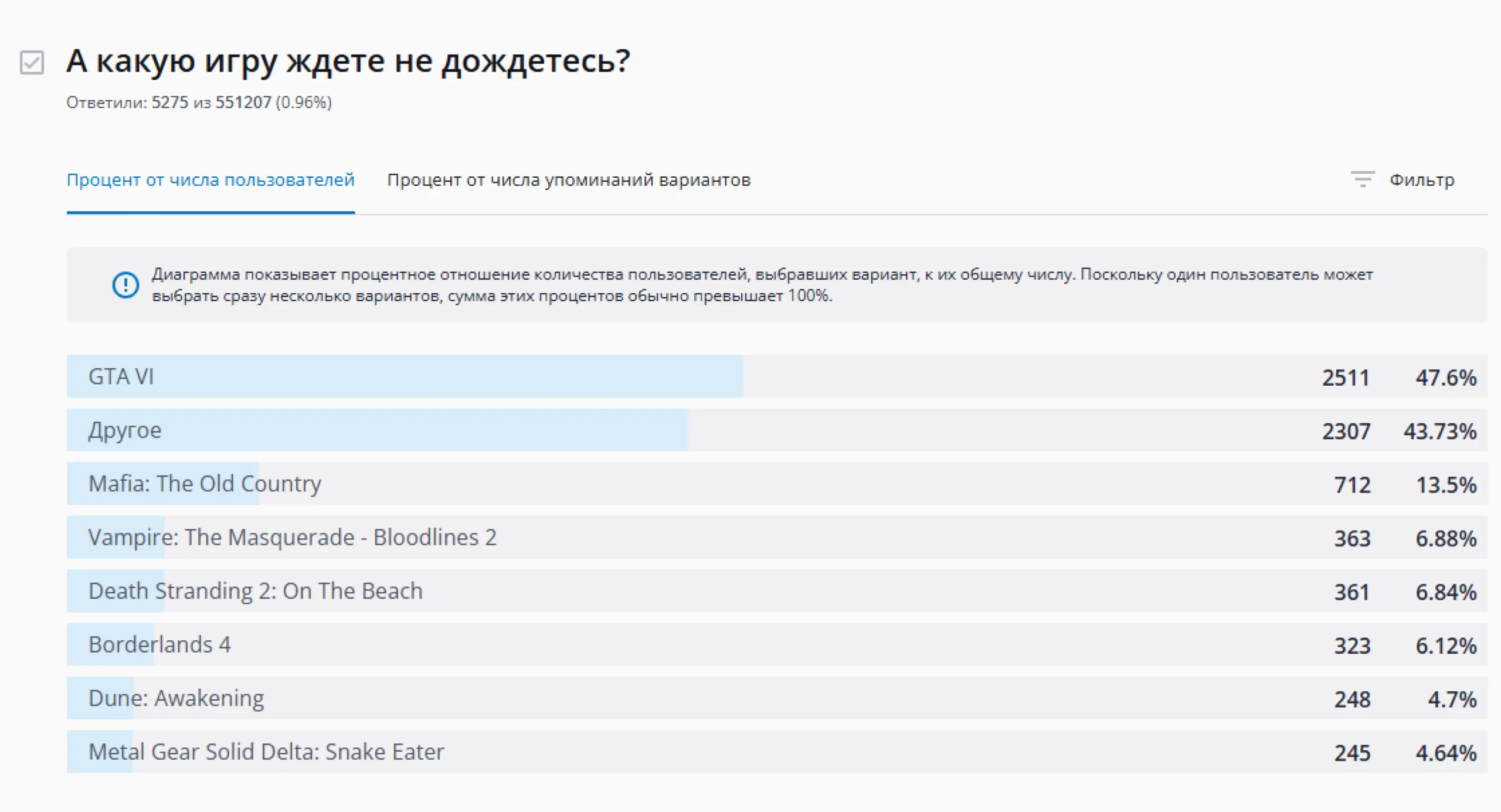 Ну и, само собой, я не могла не задать один из моих любимых вопросов: какую игру ждете в будущем? Уже поняла, что немного ошиблась с вариантами ответов, взяв только грядущие релизы 2025 года. Именно поэтому в тройку лидеров по процентам попал вариант «Другое». Впрочем, смотрите сами: