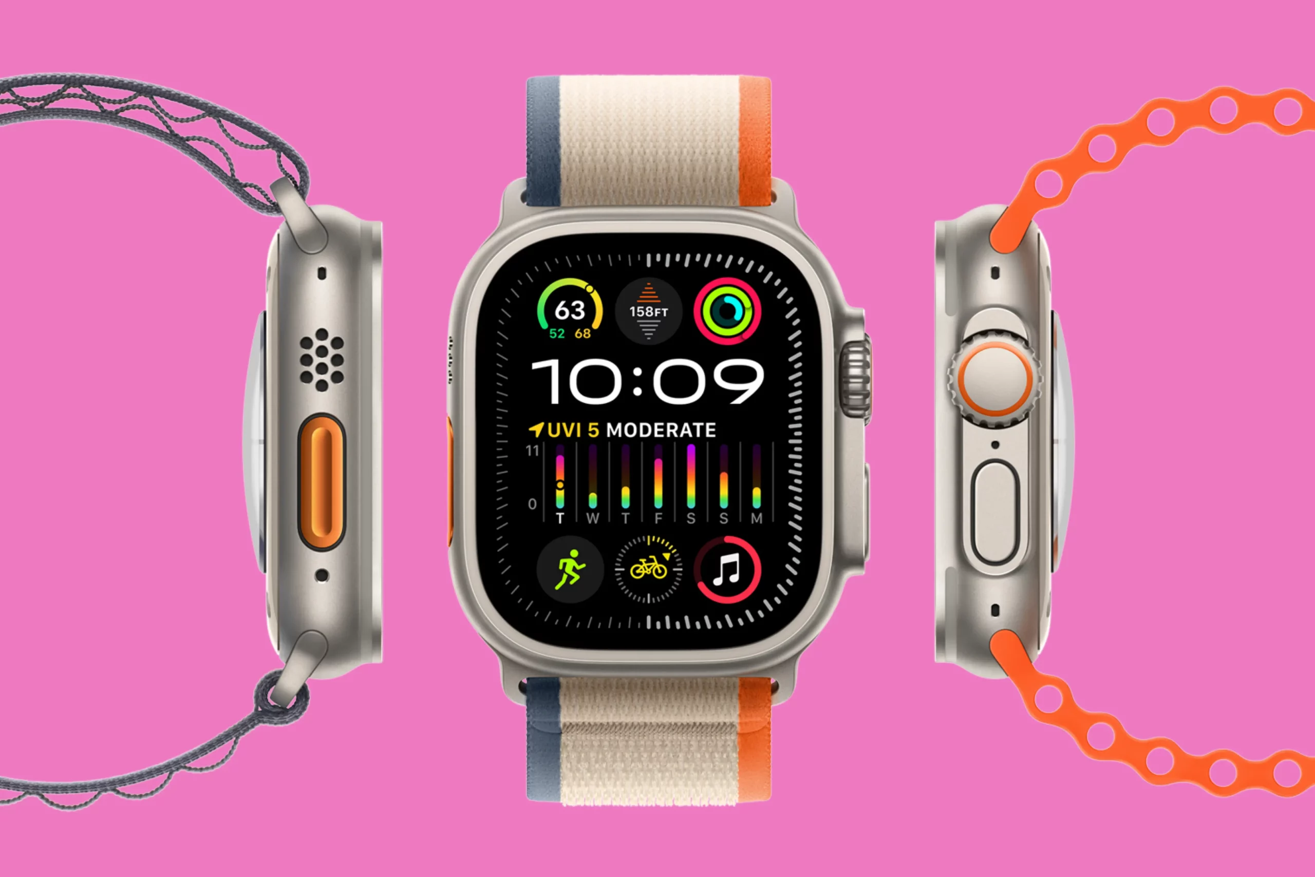 Модификация Ultra 2 умеет все то же самое, но выпускается только в титановом корпусе. Модель получила плоский экран с яркостью до 3000 нит, более емкую АКБ, глубиномер до 40 метров, режим помощи при всплытии для дайверов, более точный двухчастотный датчик GPS и функцию сирены для экстренных ситуаций.