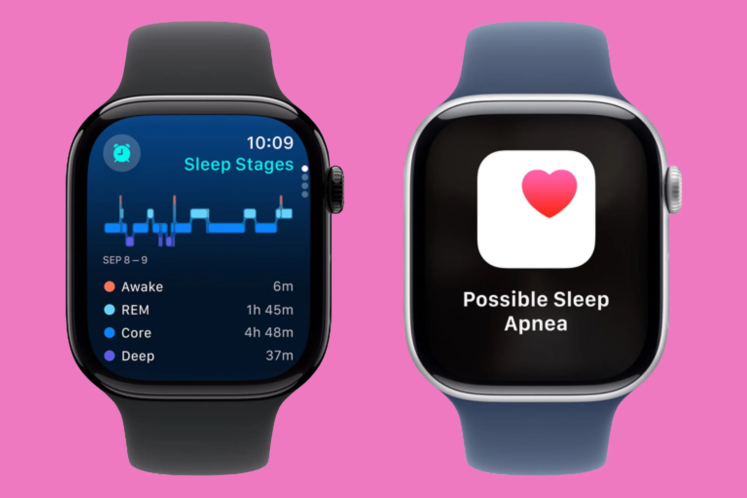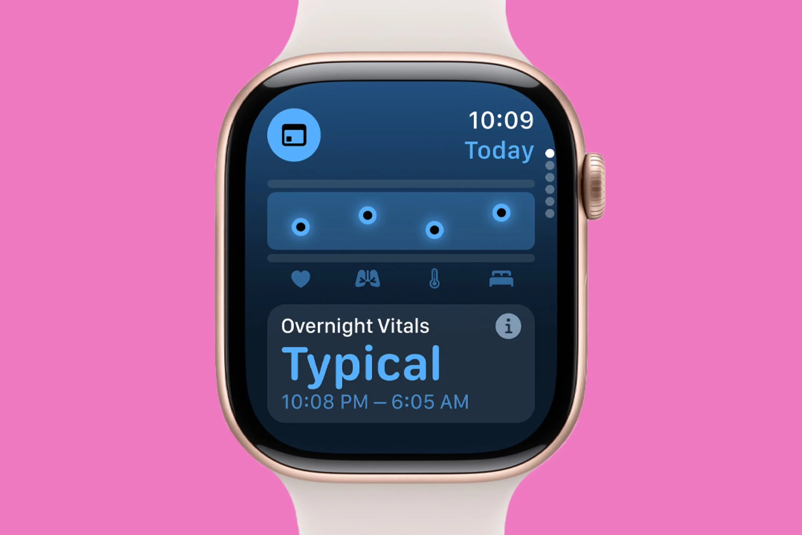 Ночью часы отслеживают показатели сна: время нахождения в различных фазах, среднюю продолжительность и другую статистику. Также часы оценивают здоровье человека по его сну с помощью приложения Vitals. Оно измеряет температуру тела, ЧСС, частоту дыхания и другие данные, чтобы выявить какие-либо аномалии и предупредить пользователя, например, о наличии симптомов мерцательной аритмии.