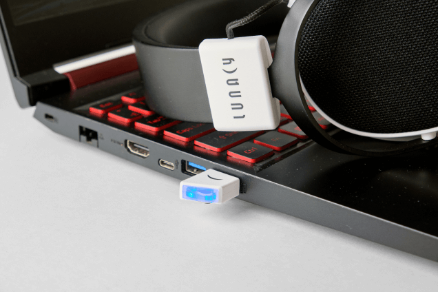 Второй вариант беспроводного подключения Lunacy Loud — радиоканал 2,4 ГГц через USB-ресивер. Передатчик оснащен светодиодной индикацией: при поиске гарнитуры он моргает, в рабочем состоянии светится синим цветом, а при выключении микрофона светодиод гаснет. Задержка при таком соединении — всего 28 миллисекунд, что позволяет комфортно играть в киберспортивных дисциплинах.