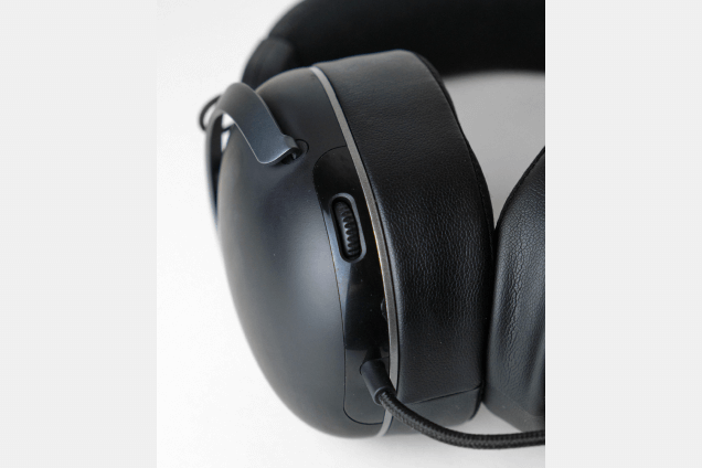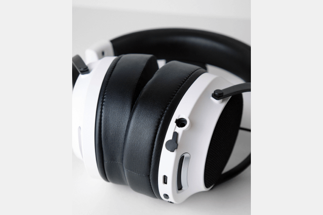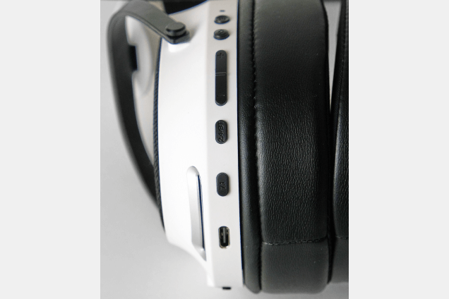 Все управление беспроводной гарнитуры Lunacy Loud вынесено на левую чашу. По порядку сверху вниз: индикатор работы (светодиод), кнопка питания, выключение микрофона, регулировка громкости «+» и «-», переключение работы Bluetooth/радиоканал, режим звука 7.1, порт Type-C для зарядки или проводного подключения.