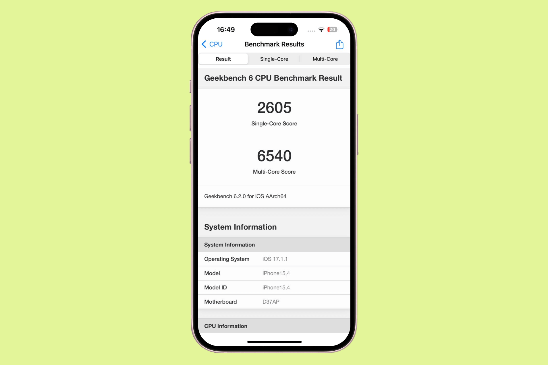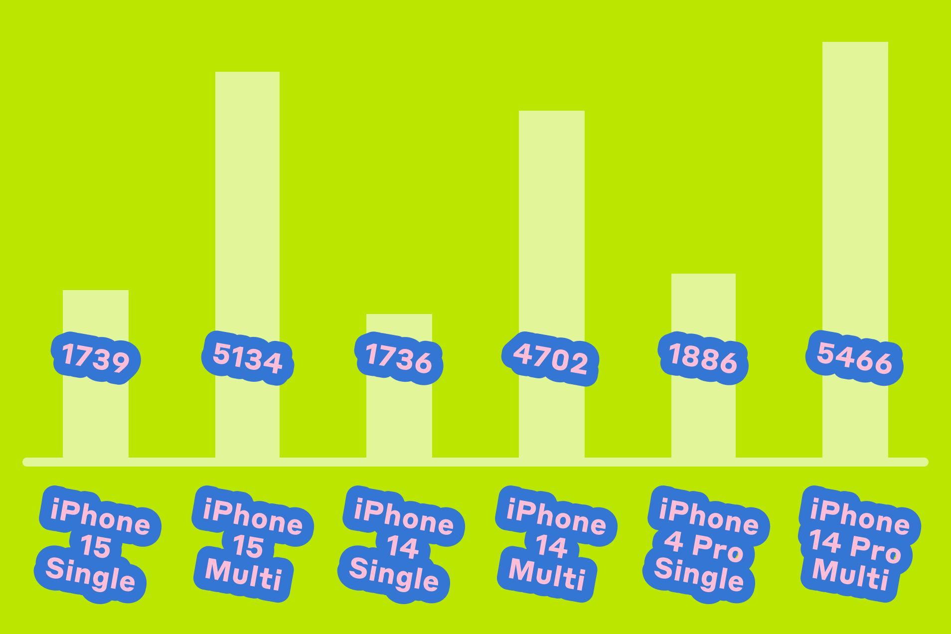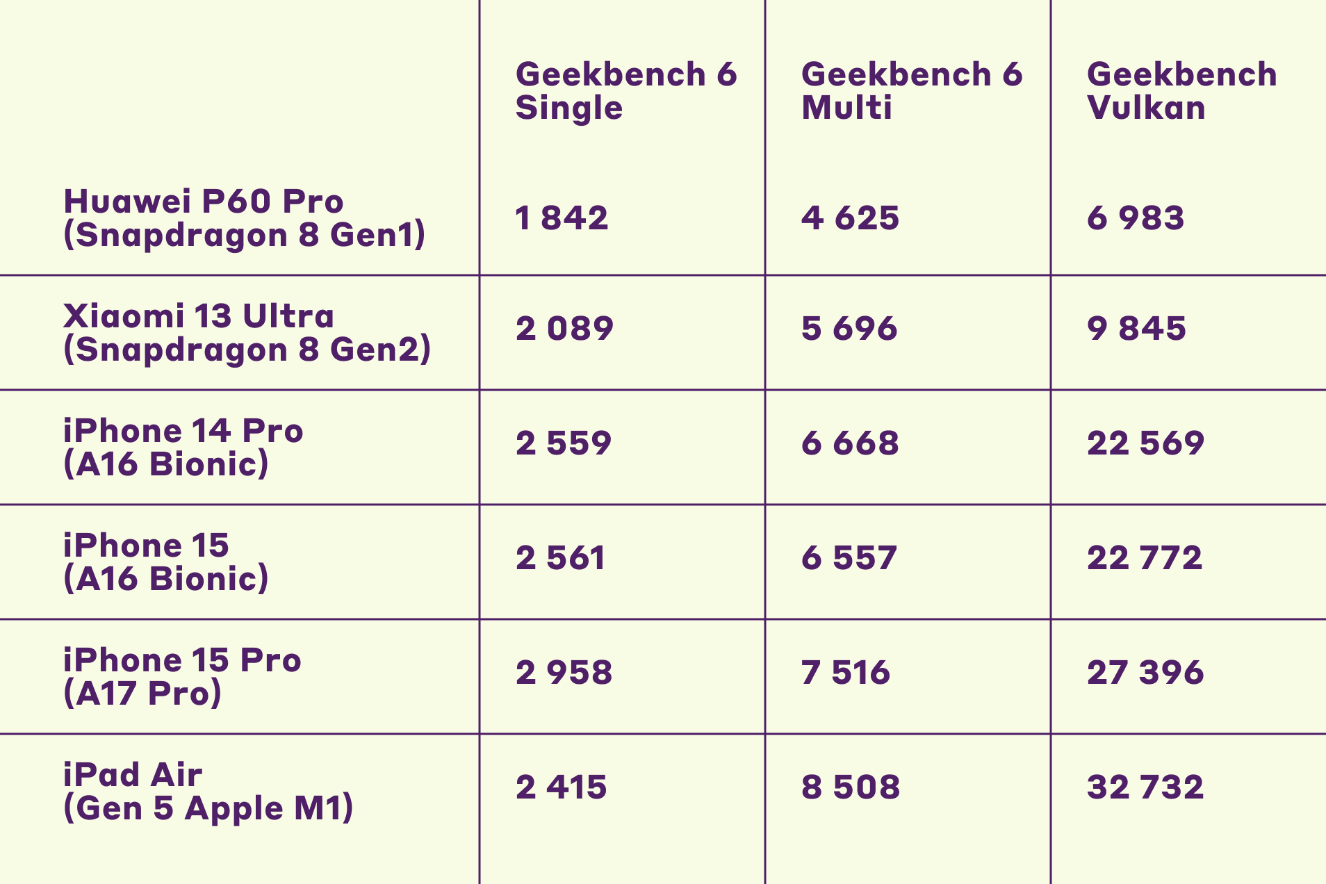 «Пятнадцатые» iPhone очень быстрые. В бенчмарках Geekbench 6 Single (одноядерная производительность), Geekbench 6 Multi (многоядерная производительность) и Geekbench Vulkan iPhone 15 с чипом A16 Bionic обгоняет флагманские HUAWEI P60 Pro и Xiaomi 13 Pro на базе Snapdragon 8 Gen 1 и Snapdragon 8 Gen 2, но отстает от iPhone 15 Pro с A17 Pro и iPad Air с M1. Производительность примерно на уровне iPhone 14 Pro.
