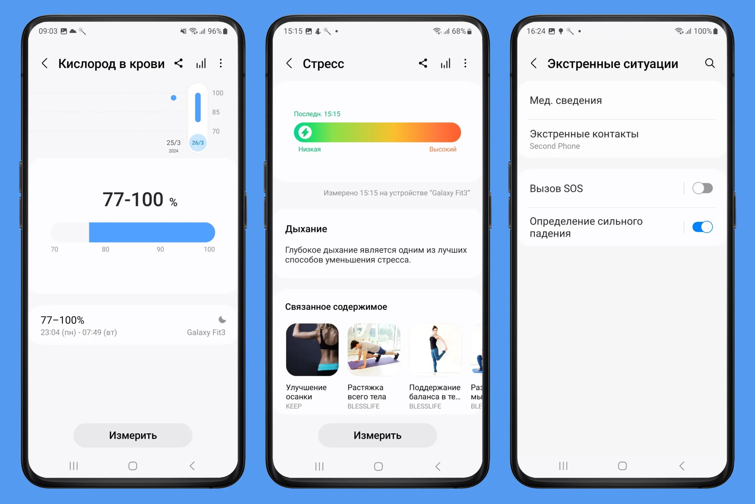 Samsung Health также позволяет измерять при помощи часов уровень кислорода в крови, рассчитывать уровень стресса. Есть даже функция определения падения: актуально для людей с болезнями опорно-двигательного аппарата, пожилых людей или, например, спортсменов-экстремалов. При падении человека Galaxy Fit3 заставят телефон позвонить на заранее добавленный на такой случай номер.