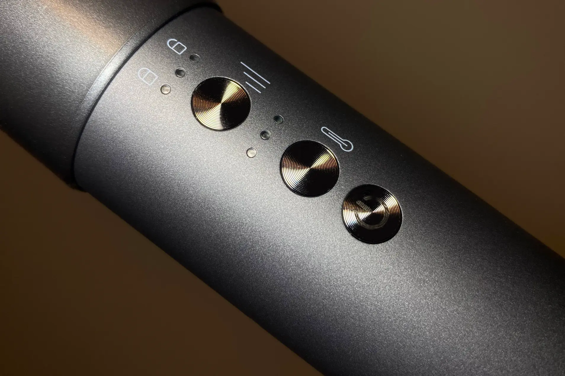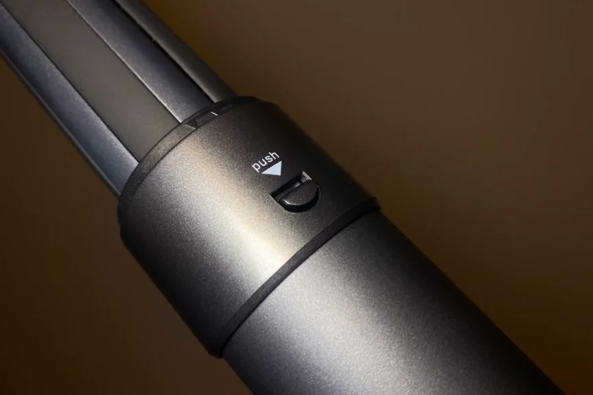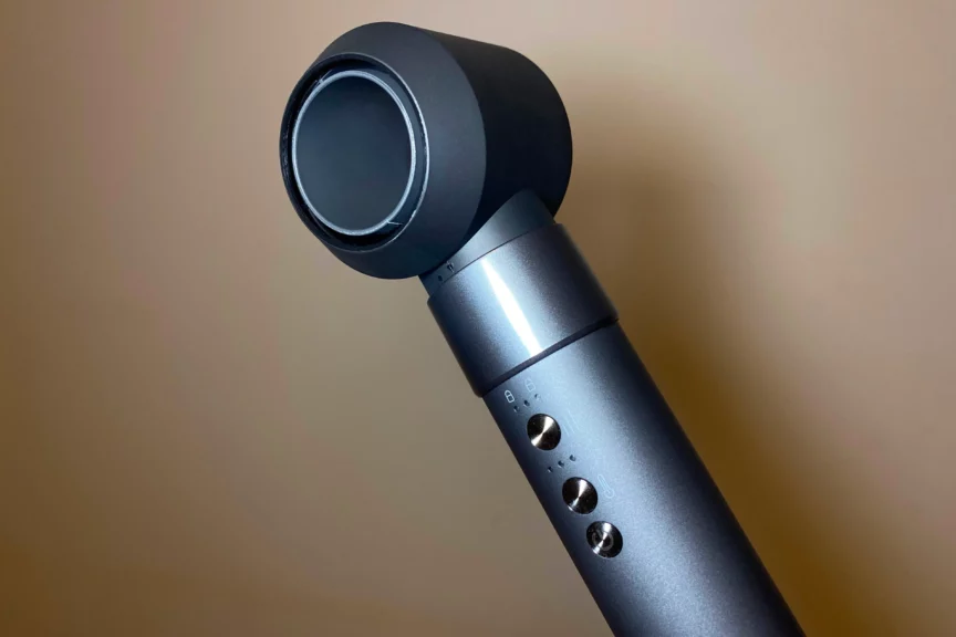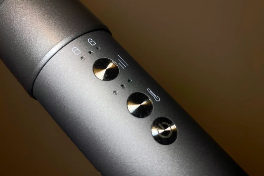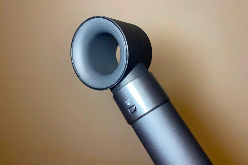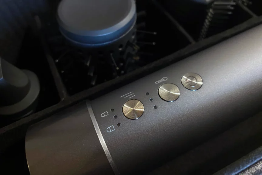Получается, используя только одно устройство, вы сможете и сушить, и выпрямлять, и завивать волосы, и придавать объем укладке. На корпусе стайлера расположены три основные кнопки. Одна отвечает за включение и выключение, а с помощью остальных можно регулировать поток воздуха и температуру. Чуть выше расположена кнопка для стыковки рукоятки с насадкой. Менять насадки достаточно легко: зажимаем этот механизм, берем нужную насадку и устанавливаем ее, немного прокручивая до характерного щелчка.