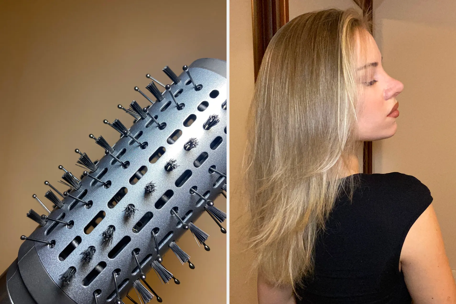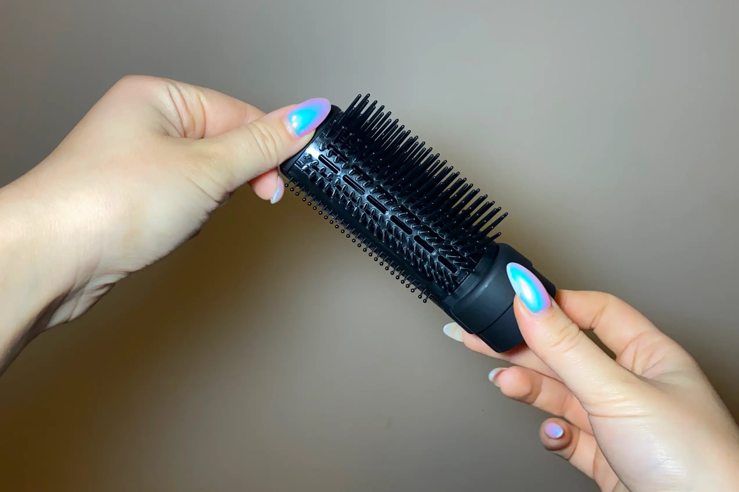 Во-первых, он очень простой в использовании. Волосы не путаются, насадка буквально скользит по ним. К тому же такой размер браша позволяет сделать более объемные локоны. Любопытно, что у этой насадки разные зубчики: пластиковые зубцы чередуются с маленькими щетинками. Лично мне это помогло качественнее фиксировать прядь на насадке во время сушки, не допуская того, чтобы волосы разлетелись в разные стороны.