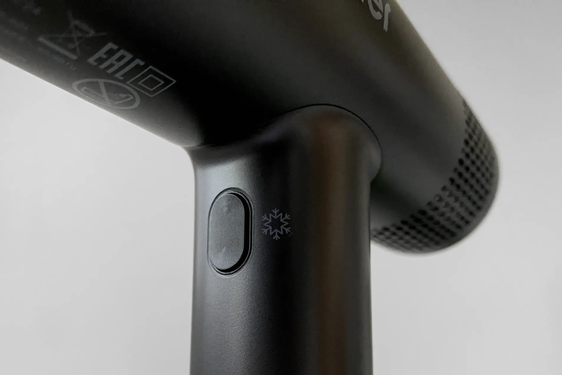 Кнопки практически незаметны из-за продуманного дизайна, но это в выключенном режиме. Когда фен включается, рядом с каждой из кнопок светятся белые индикаторы в виде крохотных снежинок. Сам корпус выполнен из алюминия, устойчив к повреждениям. Но важнее то, что фен не перегревается в руках и легко позволяет менять температуру воздуха с горячей на холодную. Еще один плюс его комплектации — съемная защитная решетка. Технически такая есть у всех фенов, разница только в исполнении. У одних моделей — это мелкая защитная сетка, у других она больше походит на решетку, и при сушке волос такими моделями локоны могут то и дело попадать в это отверстие. С Haier такое исключено: здесь защитная решетка — словно продолжение гладкого корпуса, без открытых отверстий.