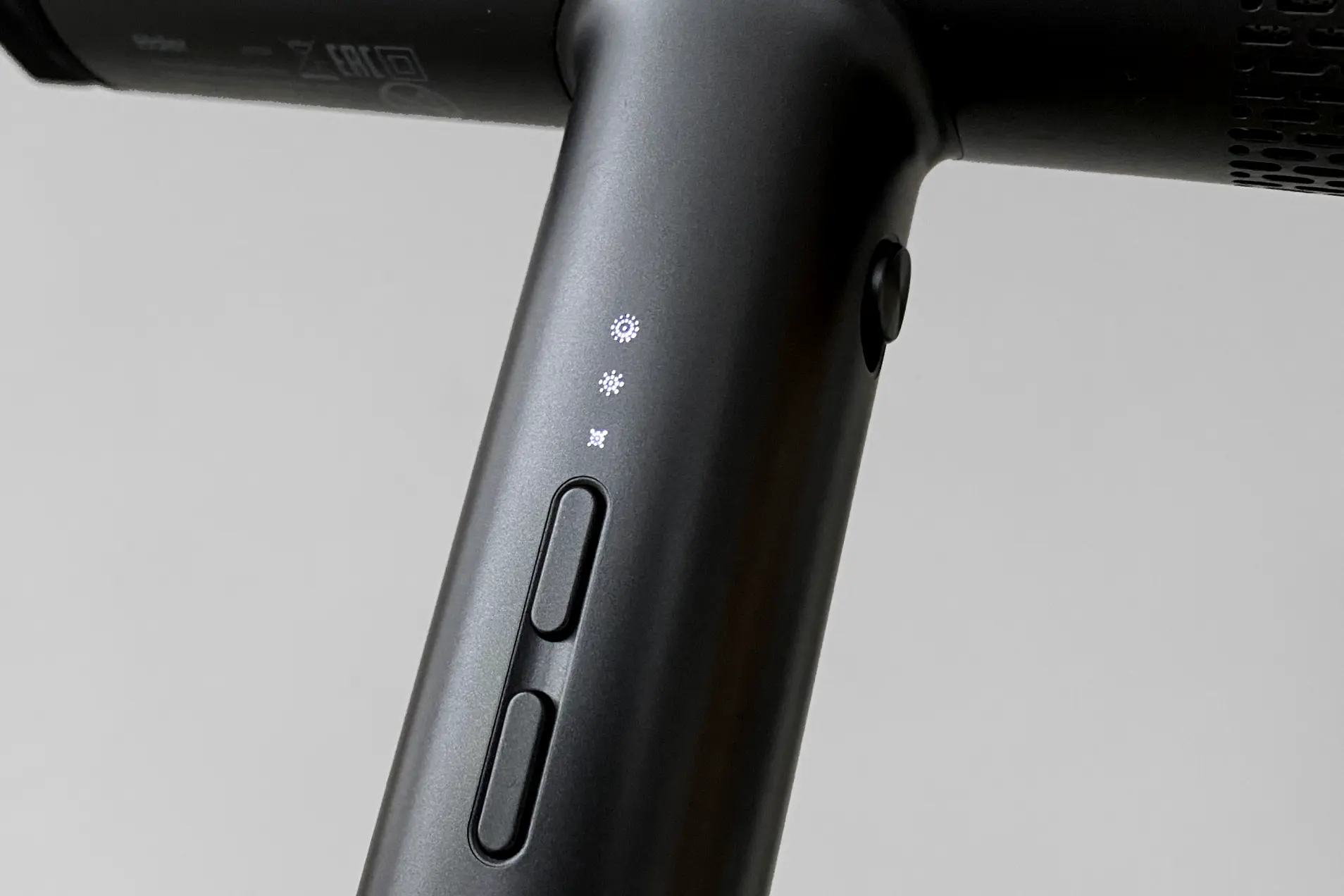 Упакован фен хорошо: качественная коробка и инструкция. Корпус у Haier HHD-601 стильный и современный. Мой — в сером металлическом оттенке, с удобной ручкой и минималистичными кнопками, каждая из которых сделана в цвет корпуса. Фен легко включается одной кнопкой. На другой грани ручки расположилась кнопка для переключения горячего и холодного потока воздуха и еще две кнопки, которые помогают регулировать скорость потока воздуха и его температуру.