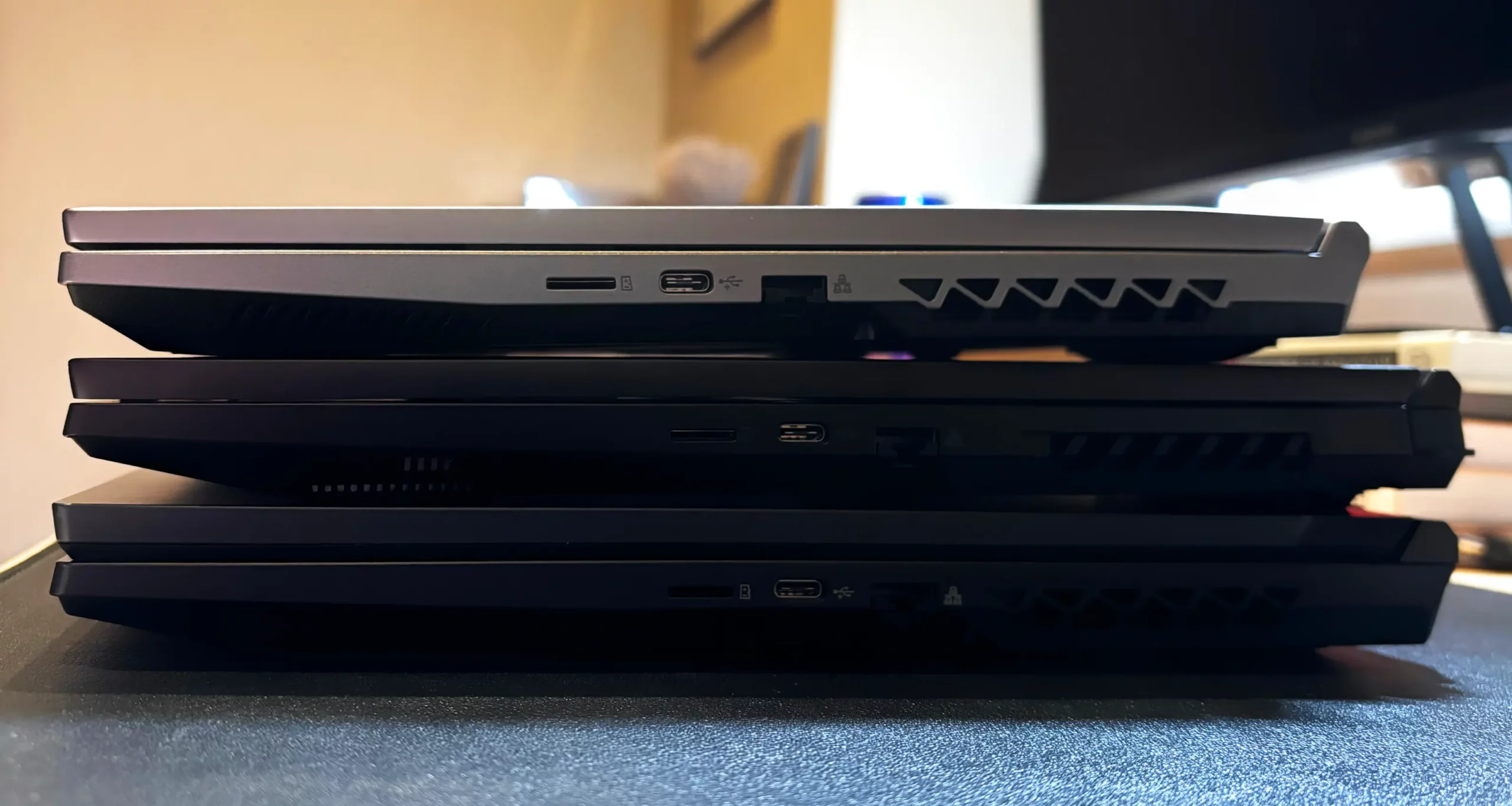 Самая «старшая» версия, конечно, сильно отличается по габаритам. Весит она уже больше 2,5 кг и лично в мой рюкзак не влезла. В толщину ноутбуки все примерно одинаковые — около 2 сантиметров.