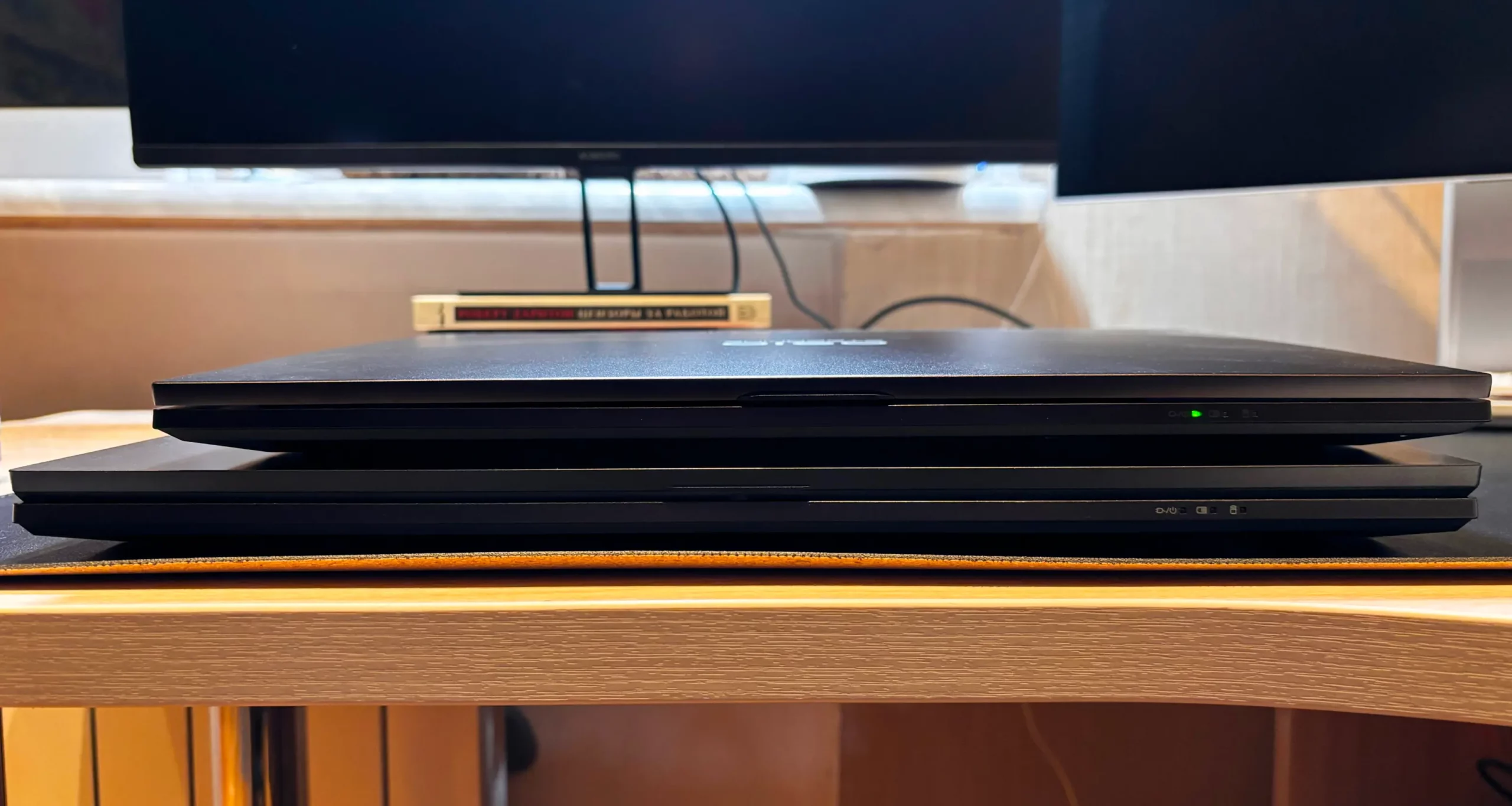 В средней версии на 16 дюймов установлены те же Intel Core i5−12600H, 16 ГБ оперативки LPDDR4, 512 SSD. Главное отличие — видеокарта NVIDIA GeForce RTX 4050, которая по синтетическим тестам показывает результаты в два раза лучше, чем у младшей модели. И это сразу ощущается: в играх и монтажных программах графика и пререндер работают быстрее и плавнее.