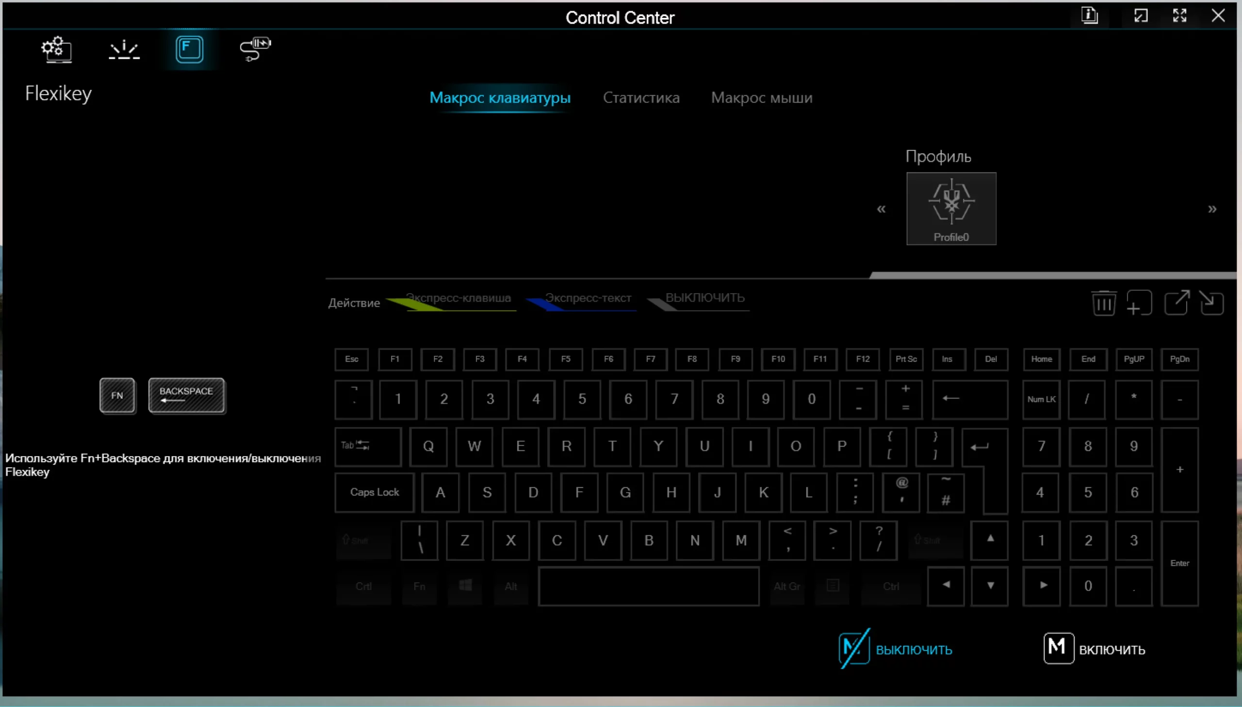 В OSiO Cyberline установлены полноразмерные клавиатуры с нампадом, но без дополнительных функциональных клавиш, которые часто любят добавлять в игровые ноутбуки. Но производитель решил эту проблему софтом — в фирменной утилите Control Center можно настраивать макросы: добавить любые действия в играх.