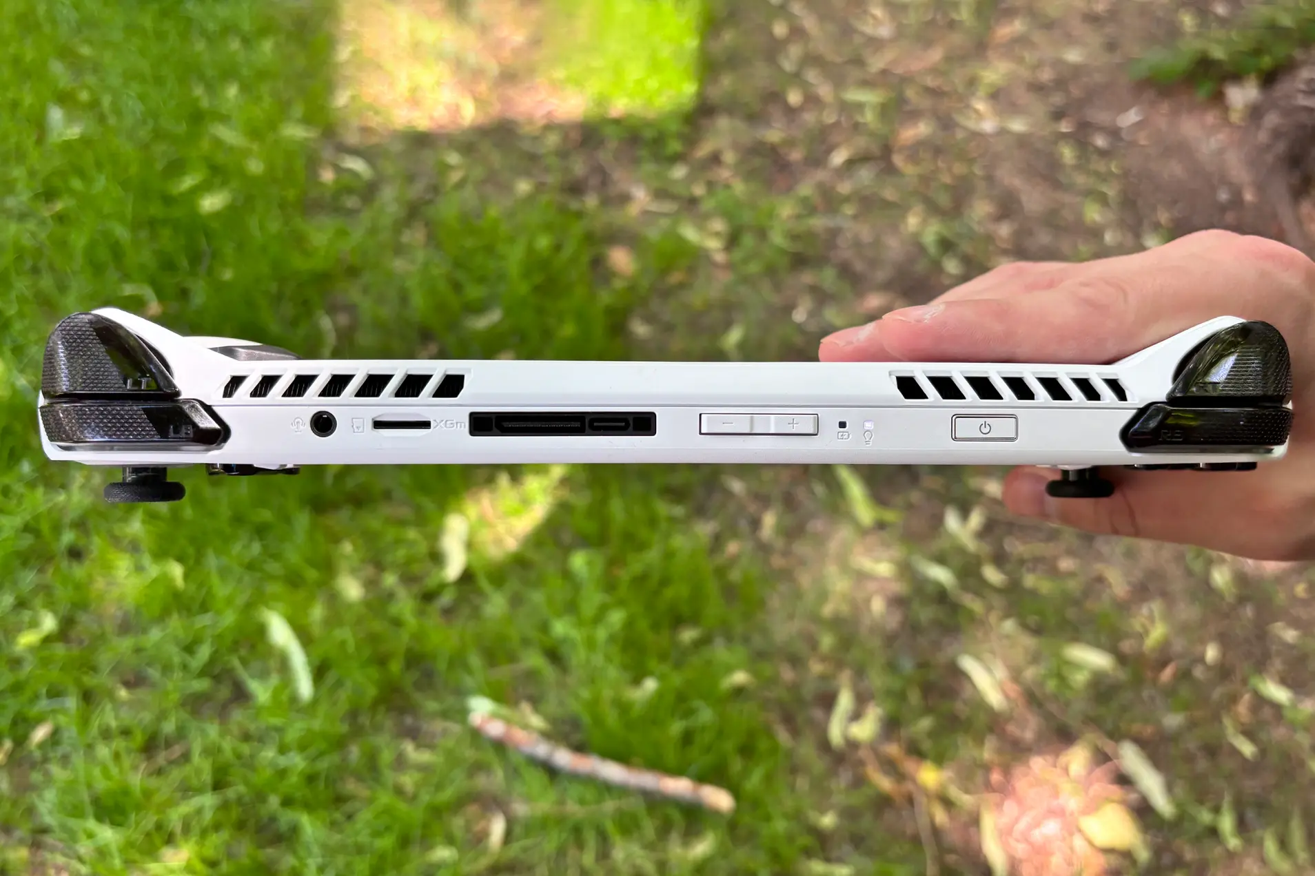 Сверху находятся кнопка включения со сканером отпечатка пальца, кнопки регулировки громкости, порт для наушников, место для SD-карты, USB-C 3.2 Gen2 и ROG XG Mobile Interface (к нему мы вернемся позже). Еще есть верхние кнопки и курки, «тугость нажатия» которых можно подкрутить прямо в настройках консоли. В общем-то, на этом все. Кажется, что в дизайне ограничились самым необходимым. И это неплохо — у ASUS получился баланс между минимализмом и удобством.