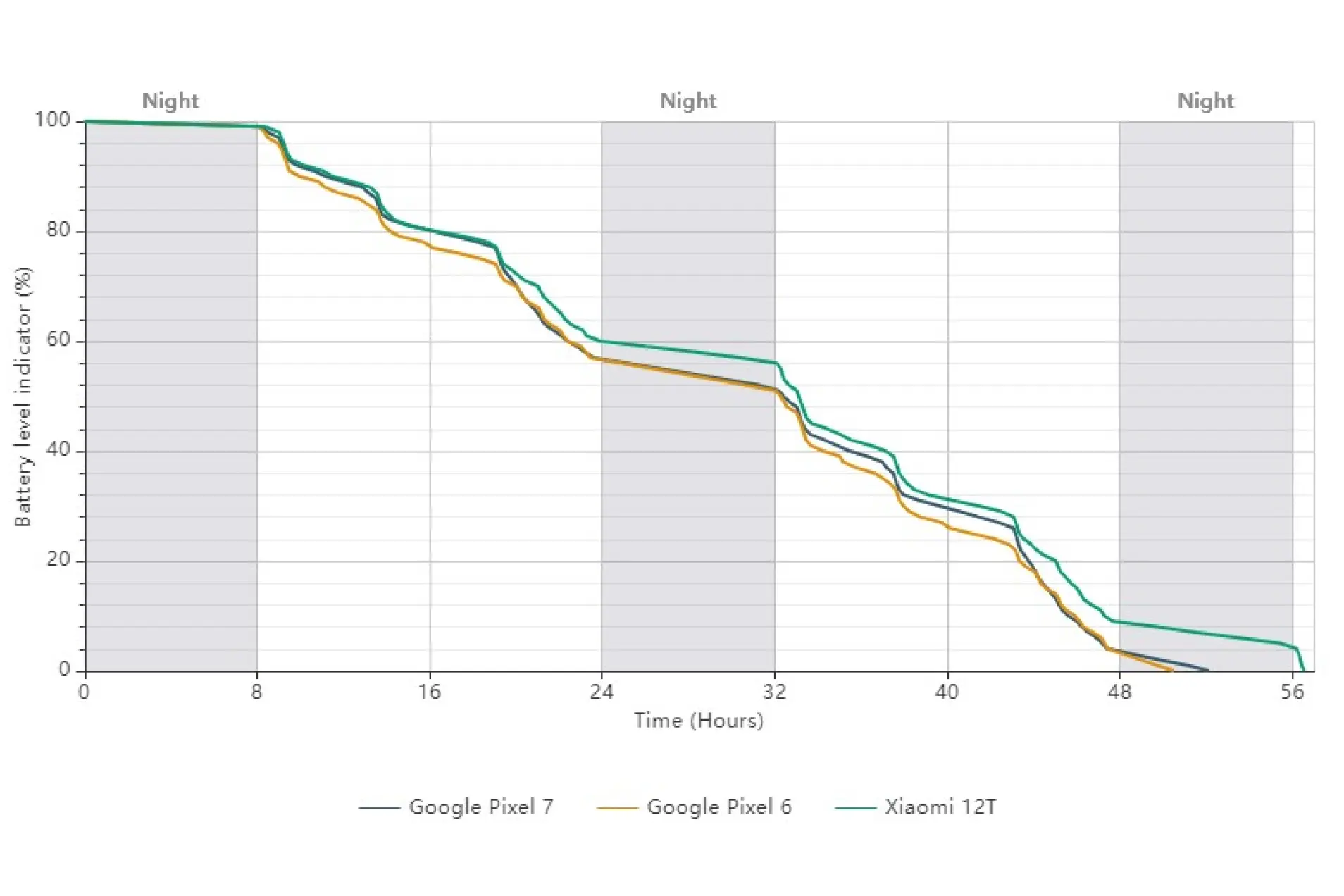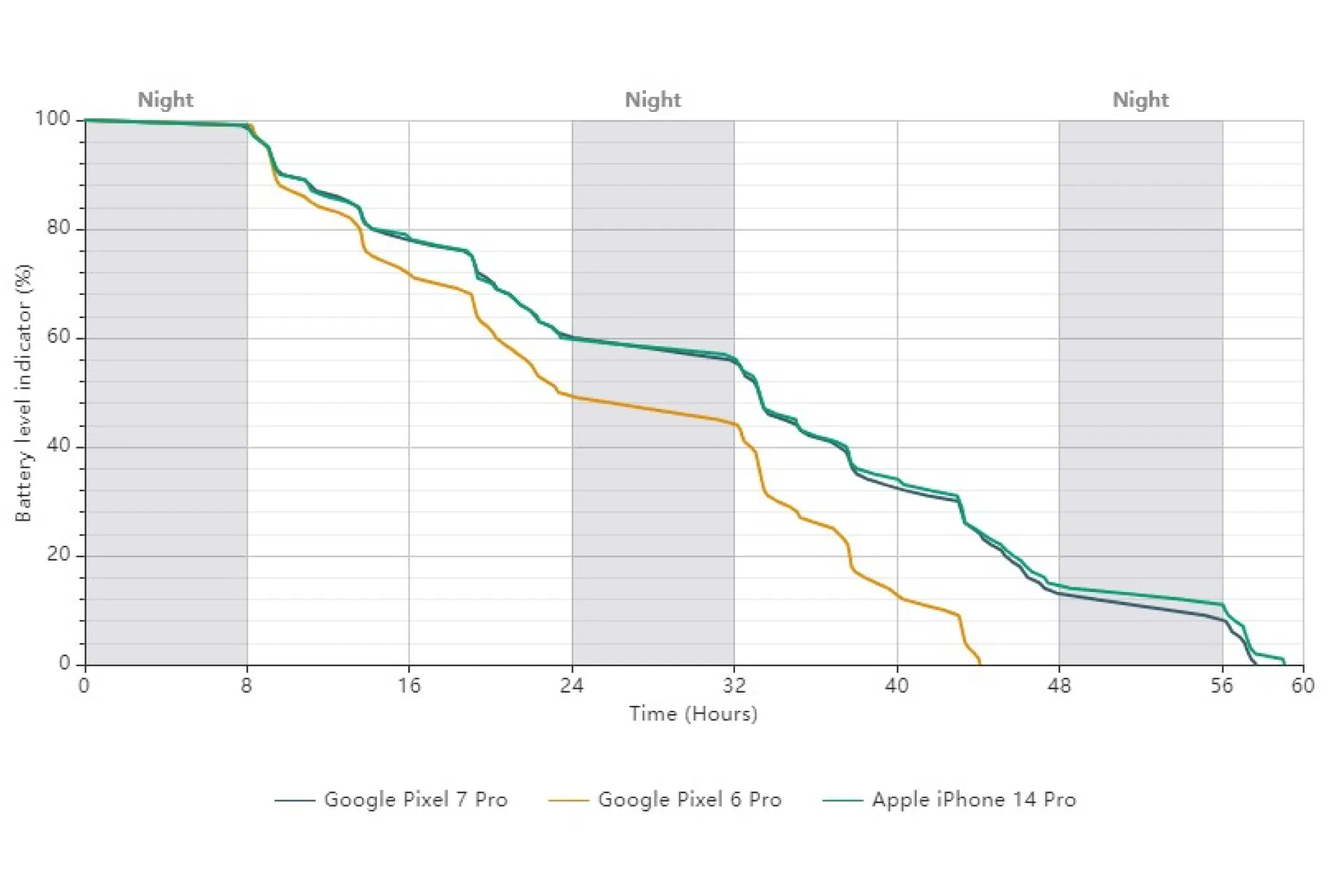 У Pixel 7 Pro емкость АКБ больше, но также больше экран и частота его обновления, поэтому время работы устройств почти одинаково. По подсчетам ресурса DxOMark, при разнообразной тестовой нагрузке (звонки, приложения и другие сценарии) базовая модель продержалась 31 час, а Pro — 33 часа. На практике смартфон будет работать без подзарядки в течение целого дня, если использовать его в режиме средней интенсивности. На графиках отображены результаты замеров при умеренно-низкой нагрузке.