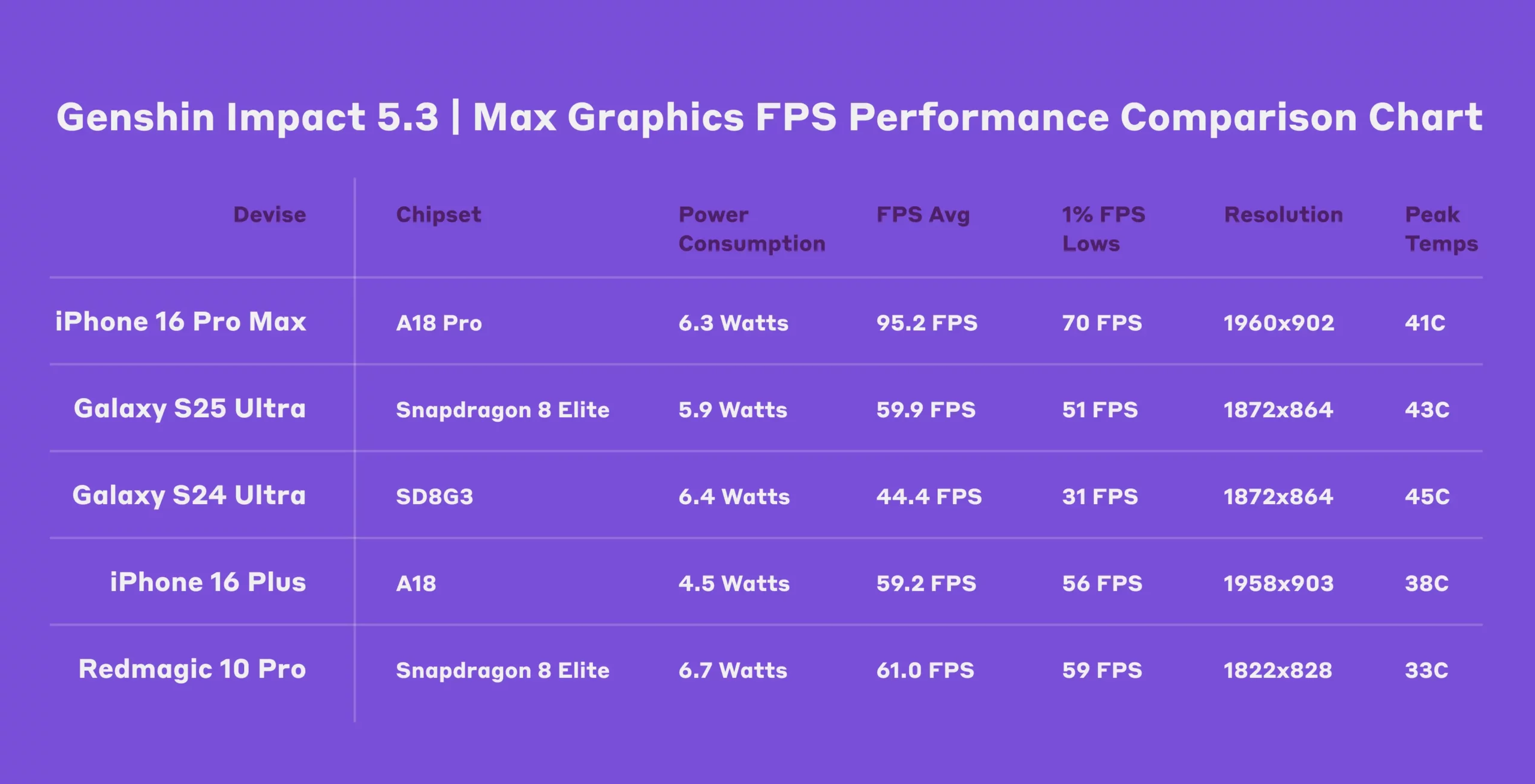 В Genshin Impact безоговорочно победил 16 Pro Max по той причине, что разработчики не предусмотрели fps более 120 для S25 Ultra и устройство «уперлось» в свой предел на уровне 60 fps. Но при том, что Samsung продемонстрировал худший результат, он нагрелся больше — до 43° против 41° у iPhone. Хотя последний опять запускал игру в большем разрешении — 1960×902 против 1872×864.
