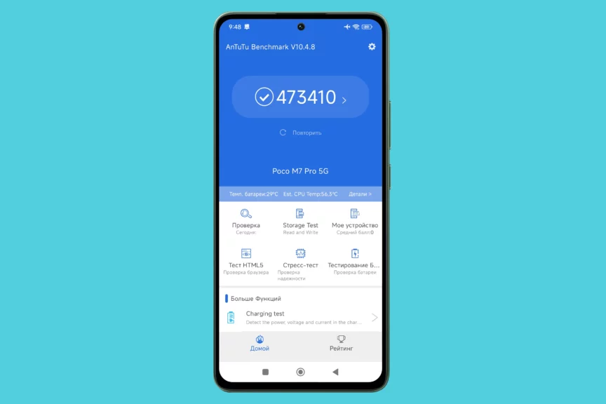 Смартфоны POCO популярны у любителей мобильного гейминга. Скорее всего, POCO M7 Pro 5G не станет исключением. Его процессор MediaTek Dimensity 7025 Ultra набирает почти полмиллиона баллов в тесте AnTuTu, а в многоядерном режиме GeekBench 6 показывает 2318 баллов. Этого достаточно не только для работы необходимых приложений, но и для запуска практически любых игр, пусть и с компромиссами в отношении качества графики. Стресс-тест смартфон тоже проходит уверенно, демонстрируя полное отсутствие проблем с перегревом.
