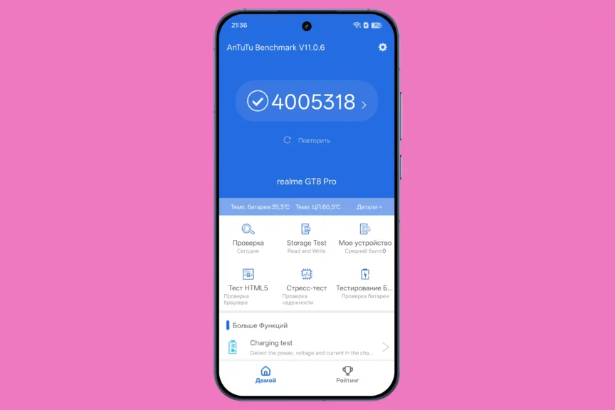 Огромная батарея на 7000 мА·ч обеспечивает realme GT 8 Pro весьма приличную автономность. При обычном использовании смартфона за день уходит около трети заряда. Посадить аккумулятор мне удалось лишь при проведении многочисленных бенчмарков и стресс-тестов, когда устройство работало буквально на пределе своих вычислительных возможностей.
