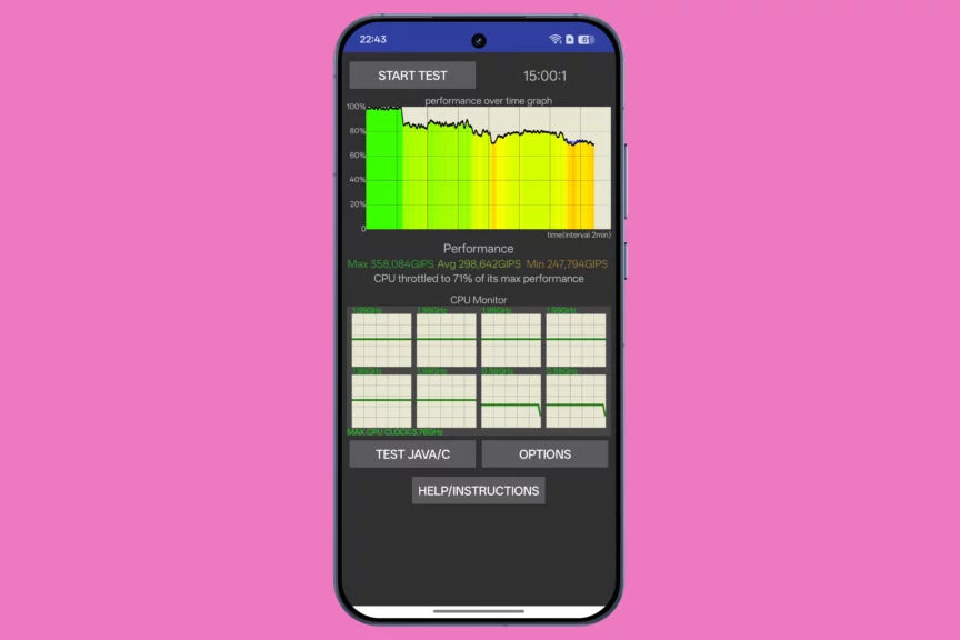 В синтетическом тесте AnTuTu новый процессор показывает абсолютно рекордные результаты — более 4 млн баллов. В GeekBench показатели также высоки: более 3000 баллов в одноядерном и более 10 000 баллов в многоядерном режиме. Ноутбуки среднего уровня сегодня выдают похожие цифры. Тесты видеографики OpenCL и Vulkan показывают более 25 000 баллов. Такие цифры смотрятся не просто очень большими, а даже избыточными для современных сценариев использования смартфона. Это запас на будущее, чтобы гаджет максимально долго не устаревал. Порадовала и работа процессора в стресс-тестах: троттлинг минимальный.