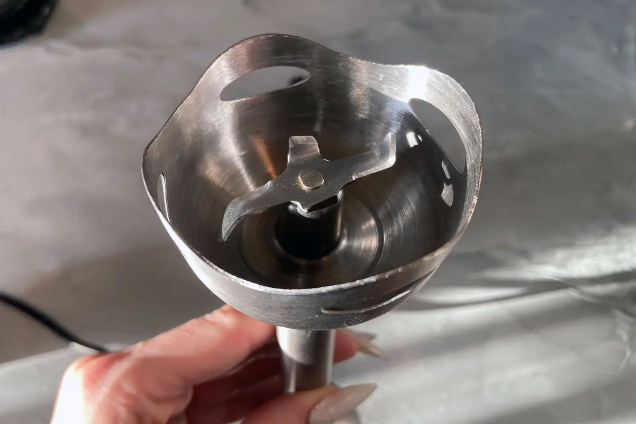 - Лезвия ножей из нержавеющей стали направлены в разные стороны — это позволяет лучше измельчать и перемешивать продукты.