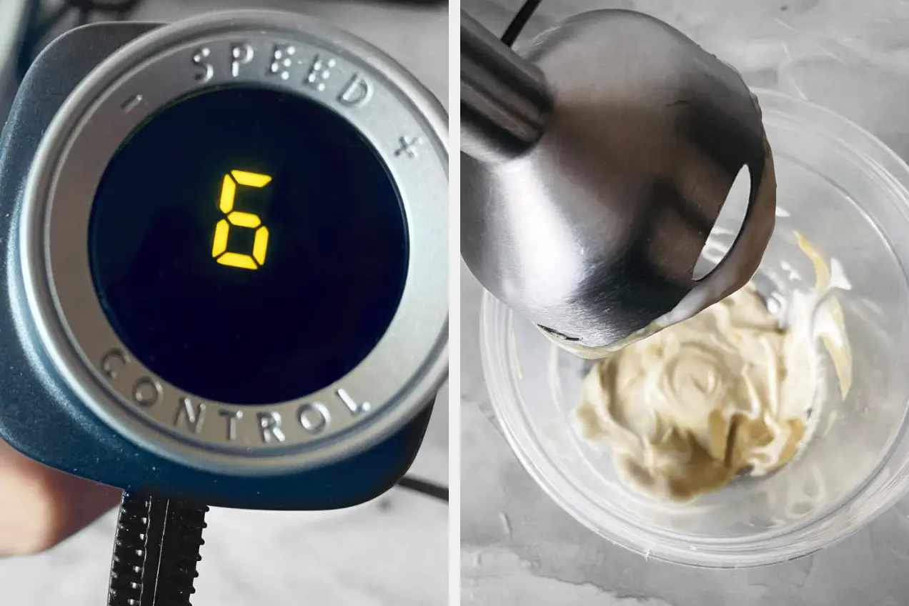 Приступим! Разбиваем яйцо (так, чтобы желток остался целым), добавляем половину чайной ложки сахара и столько же соли, немного горчицы и сока лимона. Выставляем на блендере максимальную скорость и начинаем взбивать, понемногу вливая растительное масло. Получается настоящий майонез!