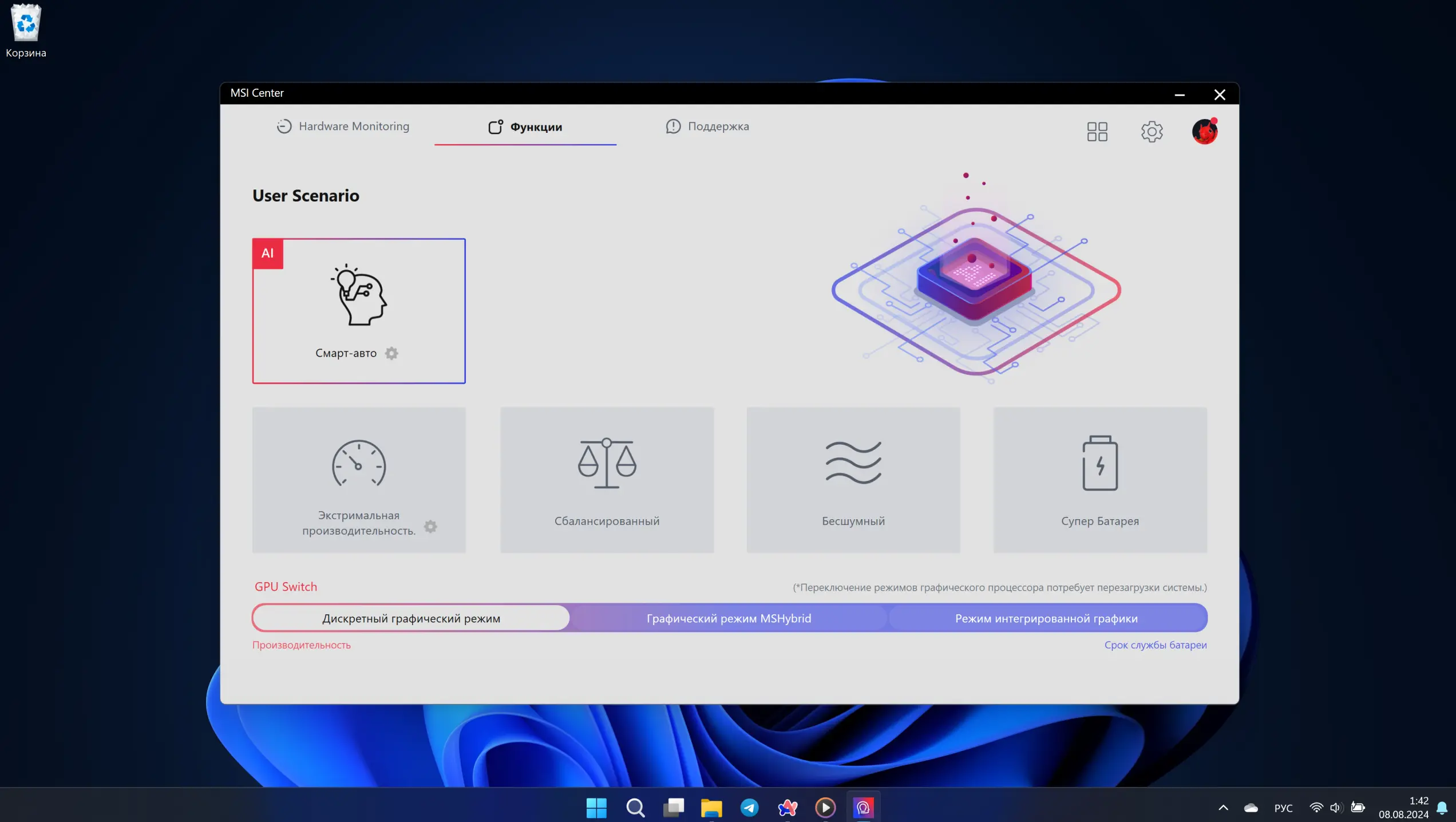 В ноутбук установлена утилита от MSI, которая корректирует вольтаж процессора и настраивает производительность. Всего есть 4 режима: максимальная производительность, сбалансированный режим, тихий и режим энергосбережения. Есть еще ИИ-режим, который корректирует нагрузку в зависимости от задач, которыми сейчас занят пользователь. Все пресеты можно быстро менять с помощью отдельной кнопки.
