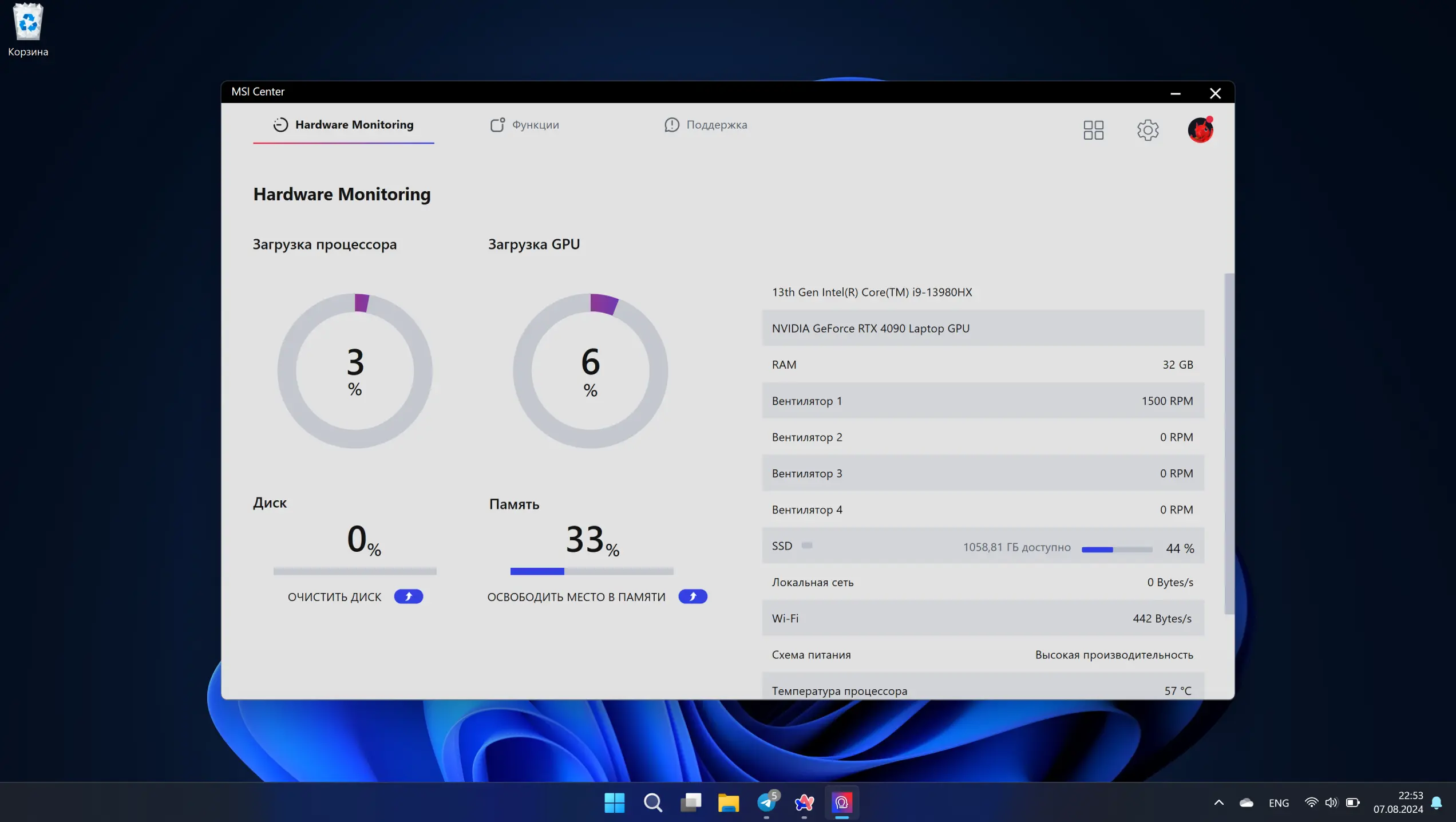 MSI Titan работает на Windows 11 Home, которая модифицирована специальной утилитой от производителя. В ней очень много функций и очень гибкая настройка. Выше уже описывали режимы производительности, но это не все. Через MSI Center можно обновлять драйверы, следить за уровнем нагрузки на процессор и видеокарты, проводить диагностику системы и многое другое. В остальном это классическая Windows с игровыми лаунчерами, программами от NVIDIA и множеством софта.