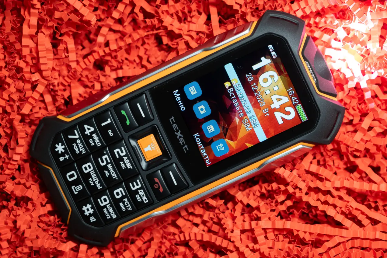 Герой нашего теста — защищенный мобильный телефон Texet TM-530R. Это не смартфон, у него даже нет Wi-Fi и 3G, не говоря уже об LTE-стандарте связи. Его задача — звонить и писать SMS, как в старые добрые времена. Впрочем, есть еще несколько полезных функций, например FM-радио, работающее через громкий динамик, встроенный фонарик (причем довольно мощный), полноразмерный USB-A разъем для подзарядки гаджетов. Фотокамеру разрешением 240×320 отнести к полезным функциям в 2024 году трудно.